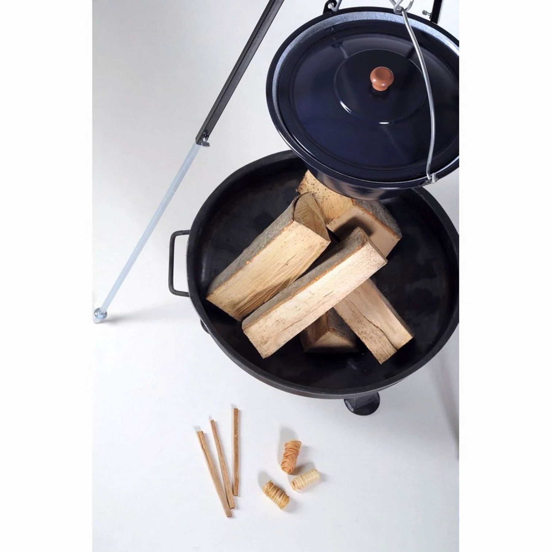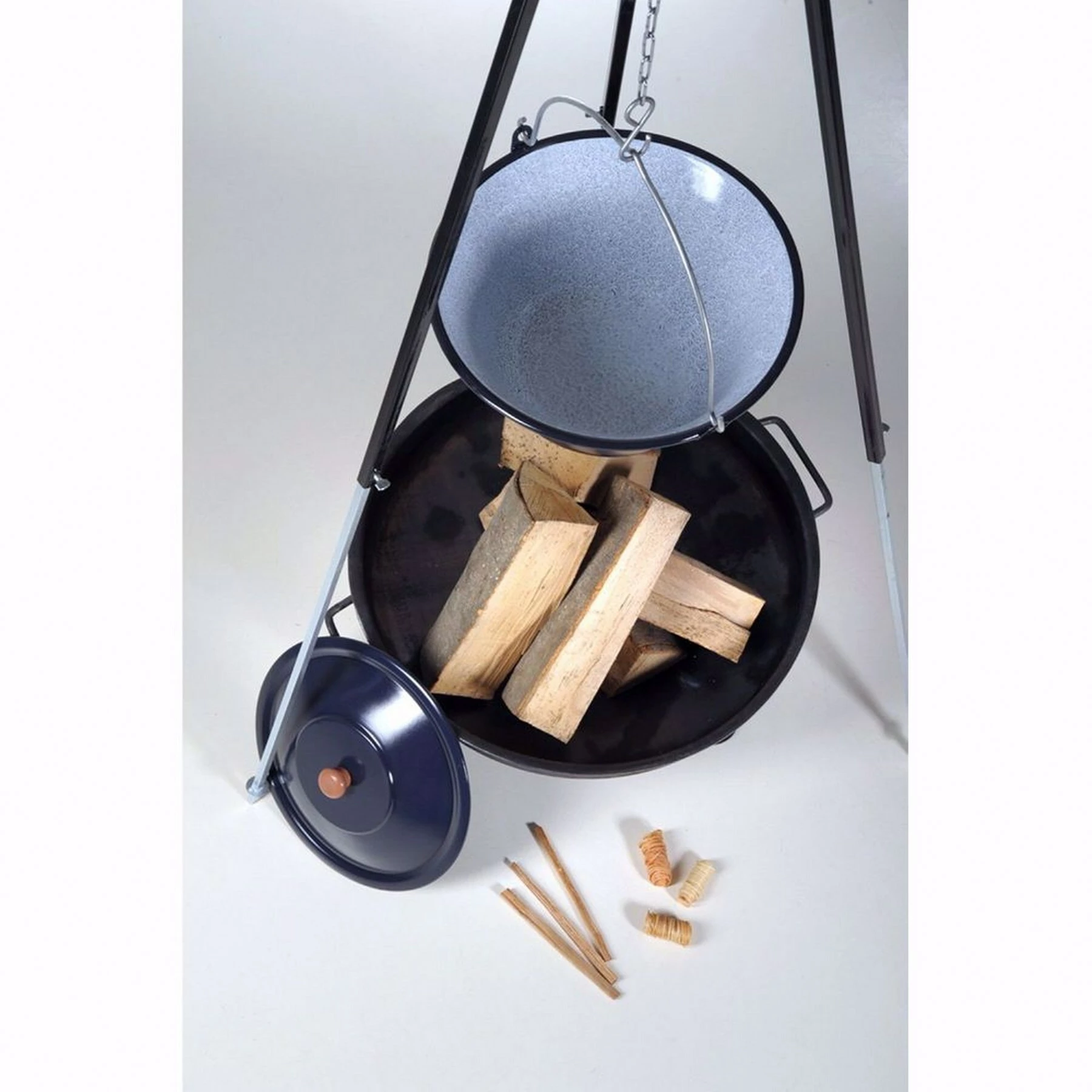- Lieferumfang Feuerschale + Dreibein + Gulaschkessel + 3 Kienspäne + 5 Stk Kaminholz Buche + 3 Anzünder (Tornados)