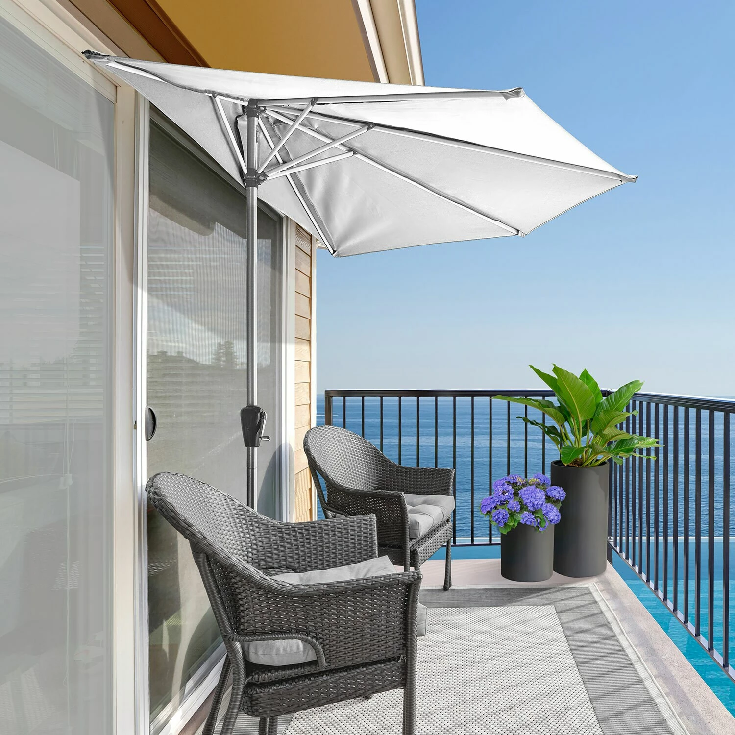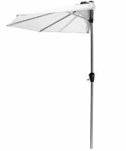 Der AMARE Sonnenschirm hat die Maße von ca. 2,7 x 1,35 m und wurde mit einem wetterbeständigen, rostfreiem Aluminiumschaft gefertigt. Duch seine spezielle Polierung erhält der Schaft eine moderne, schattierte Optik. Der Durchmesser vom stabilen Schaft beträgt 38 mm. Der Schirm ist mit einer leichtgängigen Kurbel ausgestattet, durch diese die Schirme sich leicht öffnen und schließen lassen. Durch seine halbrunde Form lässt sich der Schirm direkt an der Hauswand (z.B. über der Terrassen.- oder Balkontüre) aufstellen. Die Anzahl der Streben beträgt 5, diese bestehen aus stabilem, pulverbeschichteten Stahl. Die Textilbespannung besitzt eine Windöffnung und ist aus 100% Polyester mit ca. 180g/m² gefertigt. Der Stoff ist wasserabweisend und bietet einen UV-Schutz von 50+. Der Schirmbezug ist tauschbar und das Schirmdach kann geneigt werden. Die Gesamthöhe beträgt 235 cm.