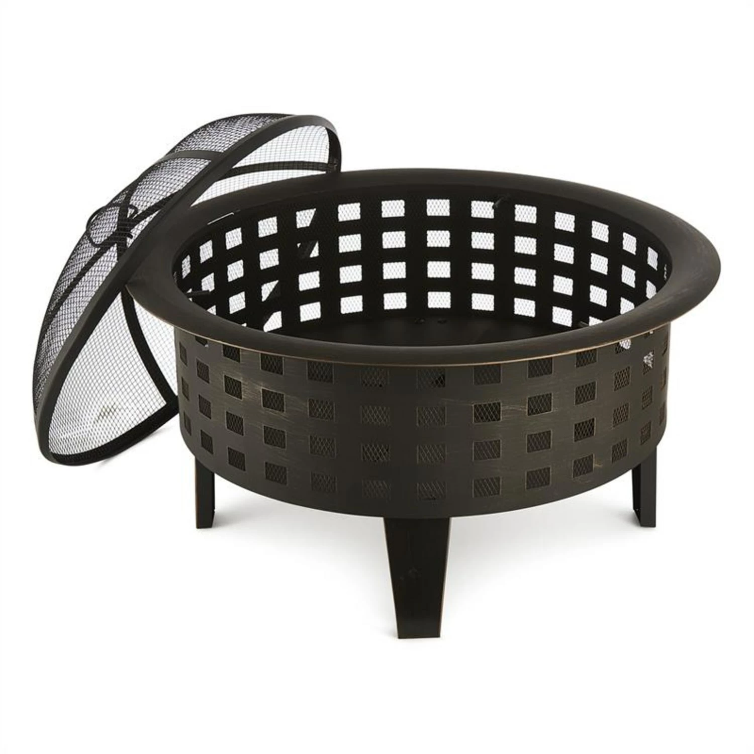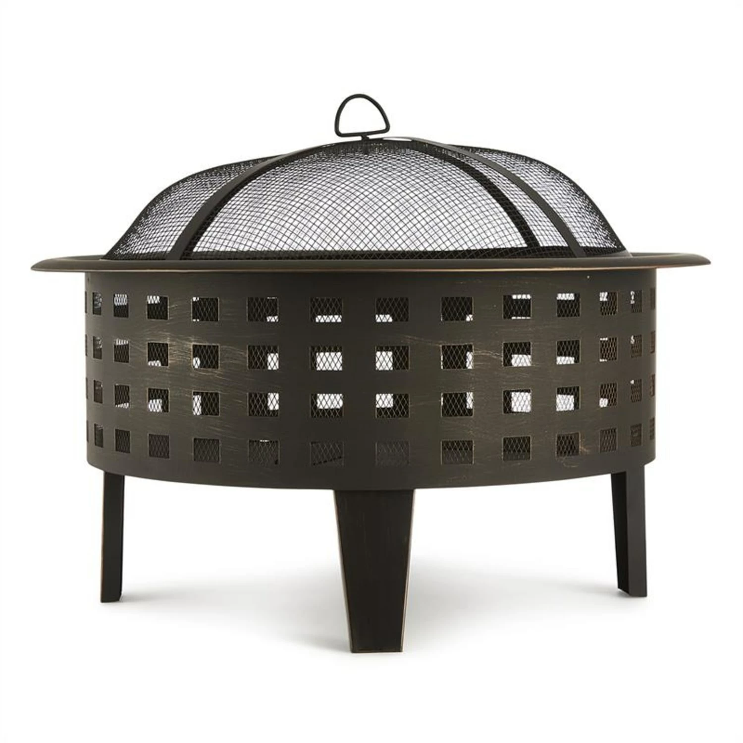 Große Feuerschale aus Stahl im Vintage-Look mit Karo-Muster, 70 cm Durchmesser und vier stabilen Standfüßen.