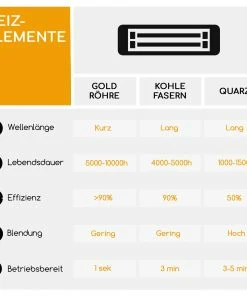 - Infrarot-Karbon-Heizelement: hocheffizient und langlebig mit extrem schneller Aufwärmphase