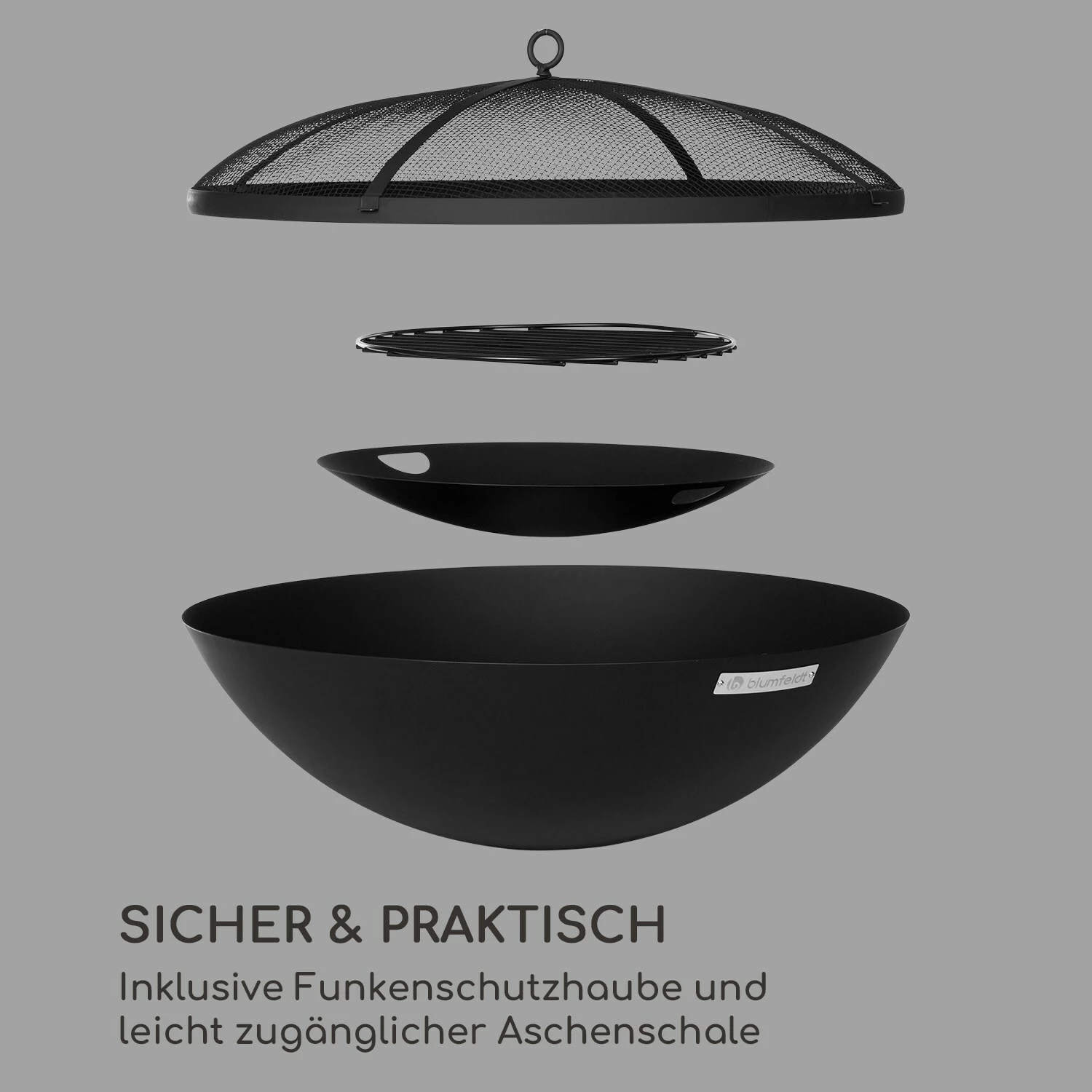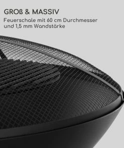 - All inclusive: Feuerschale, Standfuß, Grill- und Ascherost, Funkenschutzhaube, Schürhaken, Grillrost-Halter sowie Ascheschale