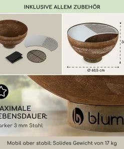 Blumfeldt Savage Feuerschale mit Grill | Ø Feuerschale: 60,5 cm | wasser- und frostfest | Brennstoff: Feuerholz oder Holzkohle | Material: Stahl | inkl. Wetterschutz | rostfarbe