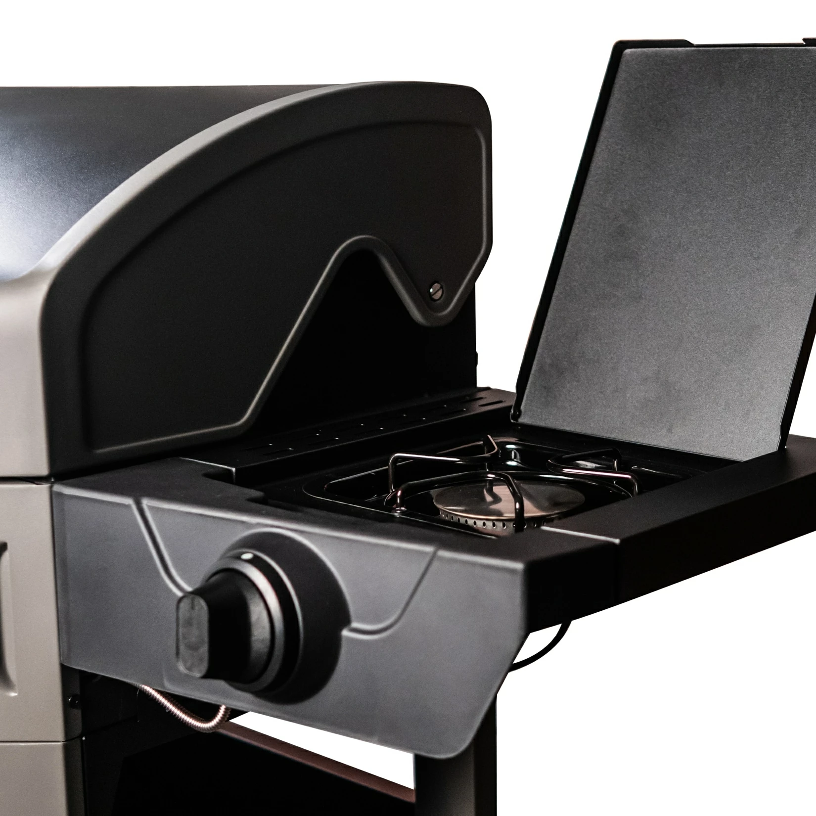 Der doppelwandige Deckel, die großen Seitenablagen und der integrierten Seitenbrenner mit 3,3 kW sorgen für herrliches Grillvergnügen.