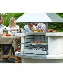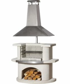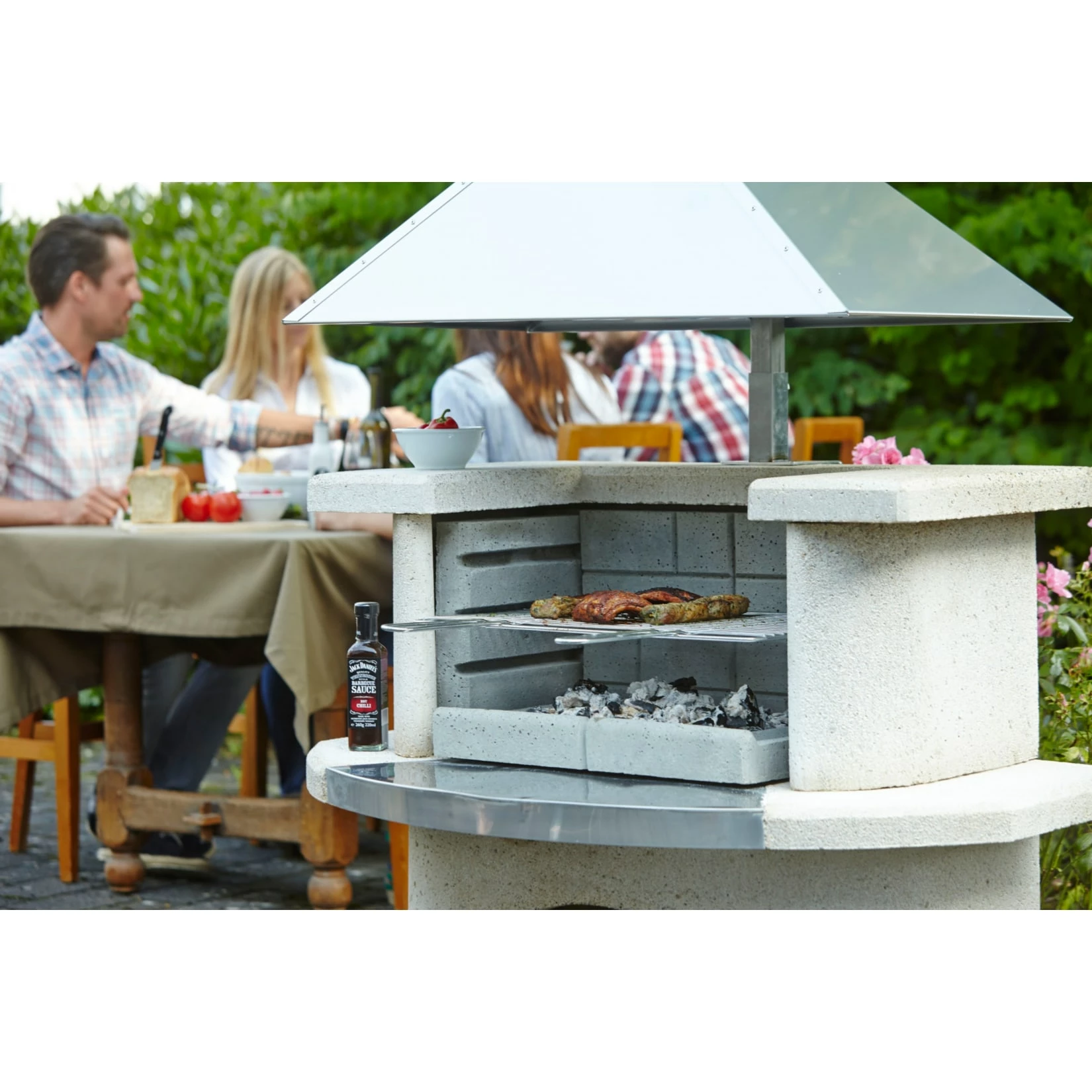 Den besonderen Reiz dieses Kamins macht die Kombination aus Edelstahl mit reinweißem Quarzstrukturbeton aus. Die Edelstahlhaube ist höhenverstellbar, damit kann der Grill- und Feuerraum optimal eingestellt werden.