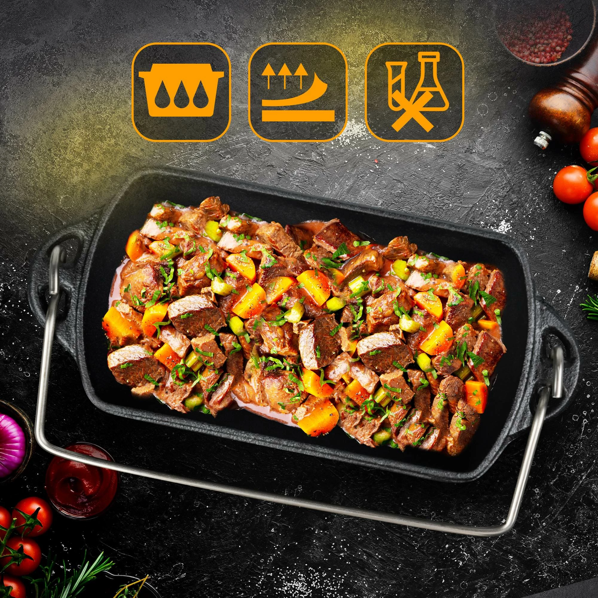 Dieser rechteckig gegossene Topf eignet sich nicht nur zum Kochen, Braten, Schmoren und Grillen, sondern auch zum Brotbacken, Kuchenbacken oder für die Zubereitung von leckeren Aufläufen.