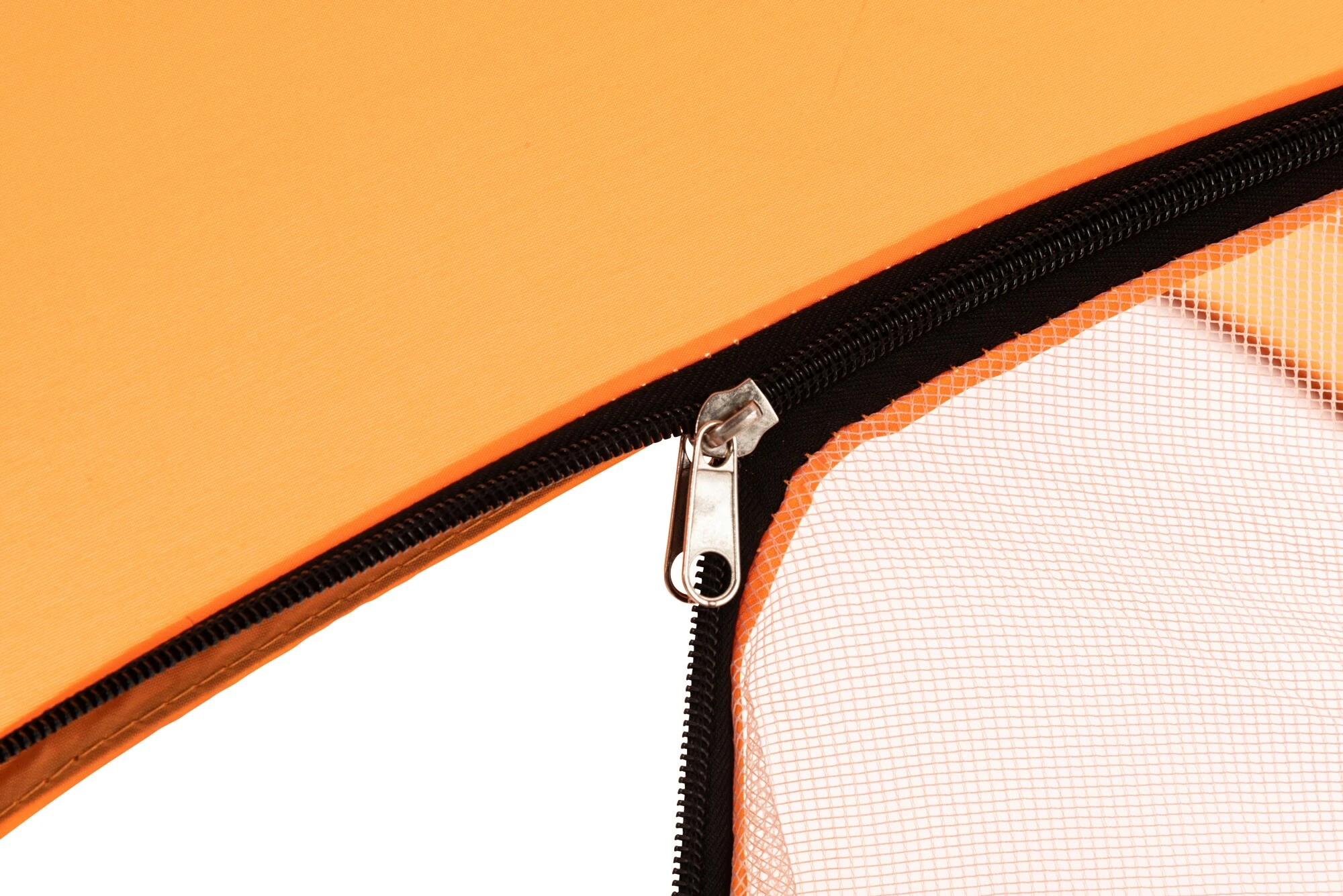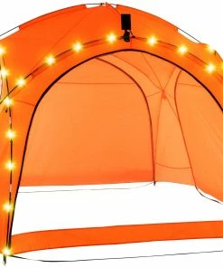 Im Innenraum ist eine große Seitentasche, sowie eine zusätzliche Lampenhalterung in der Mitte. Die im Lieferumfang enthaltene Tragetasche sorgt für den einfachen und platzsparenden Transport. Für die maximale Stabilität sind noch Abspannseile und Erdhaken enthalten.