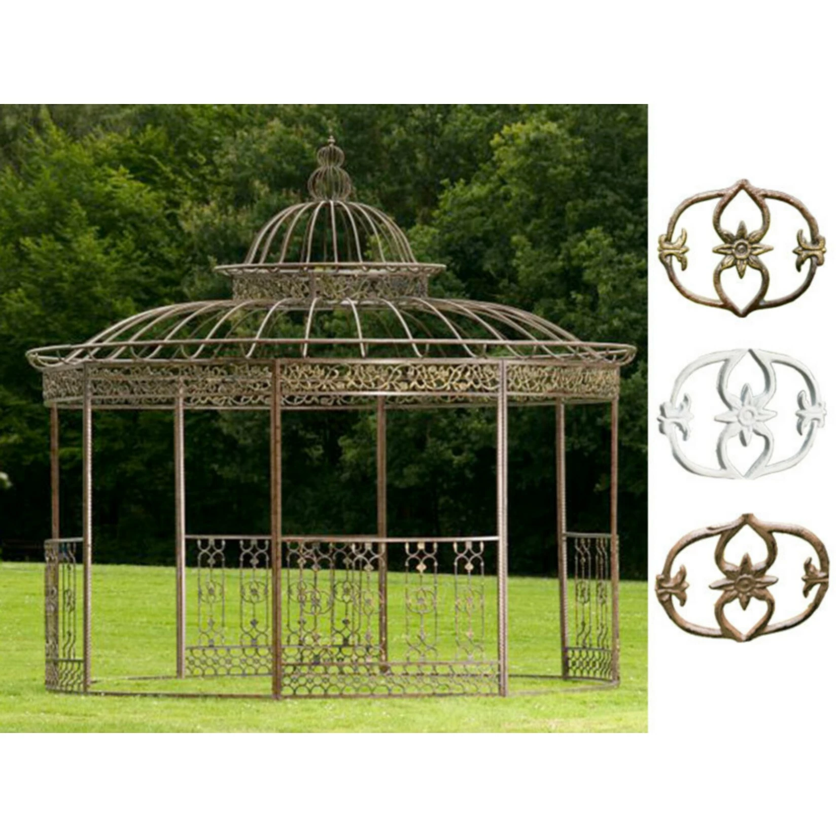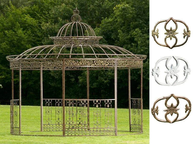 Die Beschläge und Verschraubungen sind aus stabilem Metall und wie Sie sehen, wurde hier die Materialauswahl in allen Bereichen ganz sorgfältig getroffen. Das wunderschön und in aufwendiger Handarbeit verzierte Gestell aus Eisen wurde mit einer antik nachempfundenen Rost-Patina veredelt! Exklusiver könnte ein Pavillon kaum gefertigt sein. Lange Zeit werden Sie sich an diesem Prachtstück erfreuen können und es wird Sie jedes Mal mit Stolz erfüllen, wenn Sie auf dieses Schmuckstück angesprochen werden. Sehnsüchtige Blicke Ihrer Besucher bleiben hier nicht aus und Sie können versichert sein, dass Sie von jedermann um Ihren Lieblingsplatz im Garten beneidet werden.