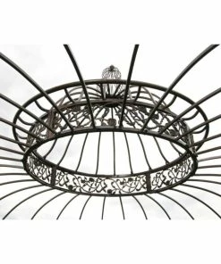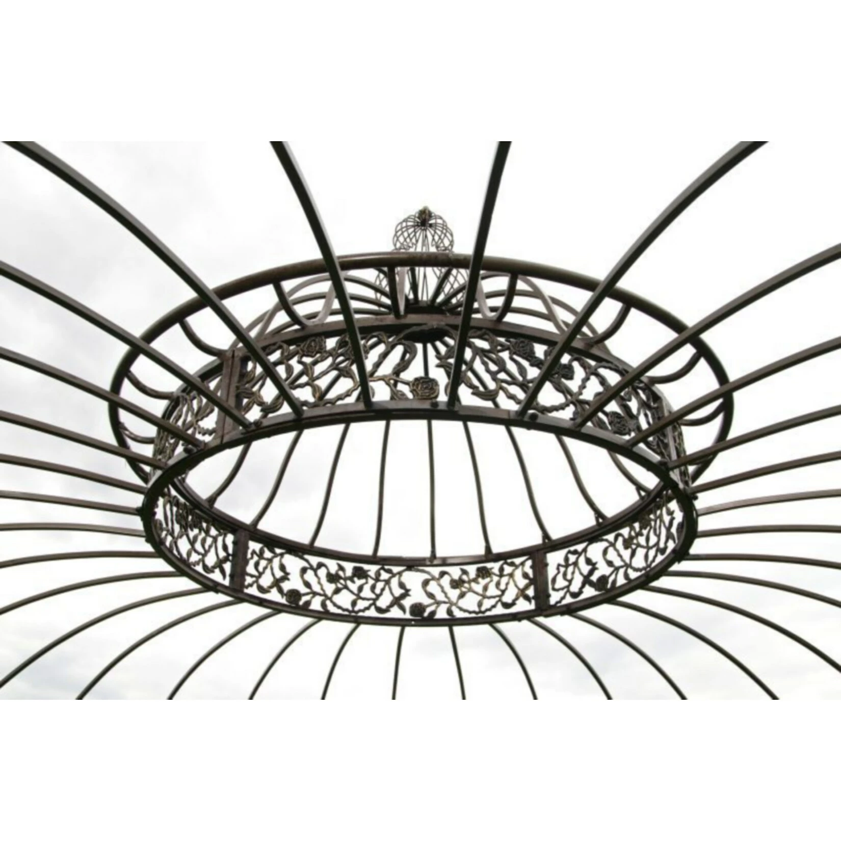 Und nicht nur das, -mit diesem Pavillon werten Sie Ihr gesamtes Grundstück auf und zwar auf die charmanteste Weise, die man sich nur vorstellen kann! Er ist freistehend als auch mit Rankpflanzen bewachsen ein absolut exklusives Highlight um Ihren Garten herausragend schön zu gestalten. Der großzügige Pavillon mit dem wunderschön verzierten und handgeschmiedeten Dach aus harmonisch geschwungenen Streben und einem Ausbrennermotiv in Form von Rosenranken und seitlichen hohen Seitenwänden lässt keinerlei Wünsche offen! Das beeindruckende Dach wird von acht stabilen Rohren getragen, die in versetzter Optik durch künstlerisch gestaltete Streben und Muster verbunden sind. Auf diese elegante Weise bleibt der offene Charakter des Pavillons erhalten, während zugleich ein geschützter Raum für Ihre stilvolle Sitzgruppe geschaffen wird.