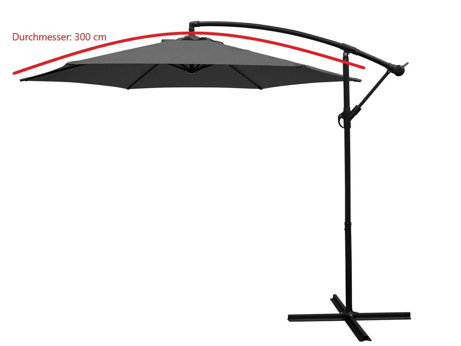 Hochwertiger Ampelschirm im Farbton grau, Durchmesser 300cm. Das widerstandsfähige Gestell ist aus Aluminium gefertigt und somit rostfrei (Unterteil, Ständer + Streben teilw.: Stahl). Das Gestell ist passend zu der Bespannung in anthrazit gehalten.