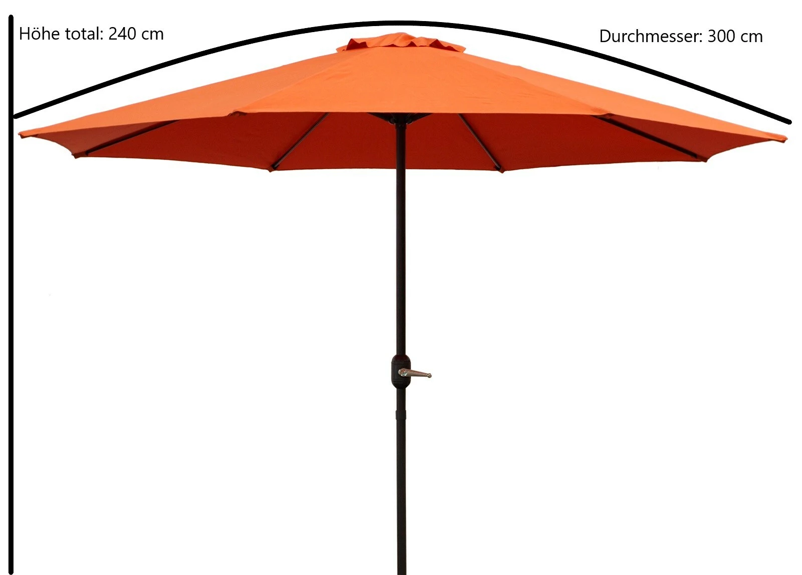 Solider Marktschirm / Landhausschirm mit Aluminiumrohr, rund (8-eckig) mit 300cm Durchmesser. Material Bezug: 100% Polyester. Das Gestänge ist anthrazit pulverbeschichtet, die Bespannung besteht aus widerstandsfähigem Polyester mit einem UV-Schutzfaktor von 50+, was der höchsten Schutzstufe entspricht.