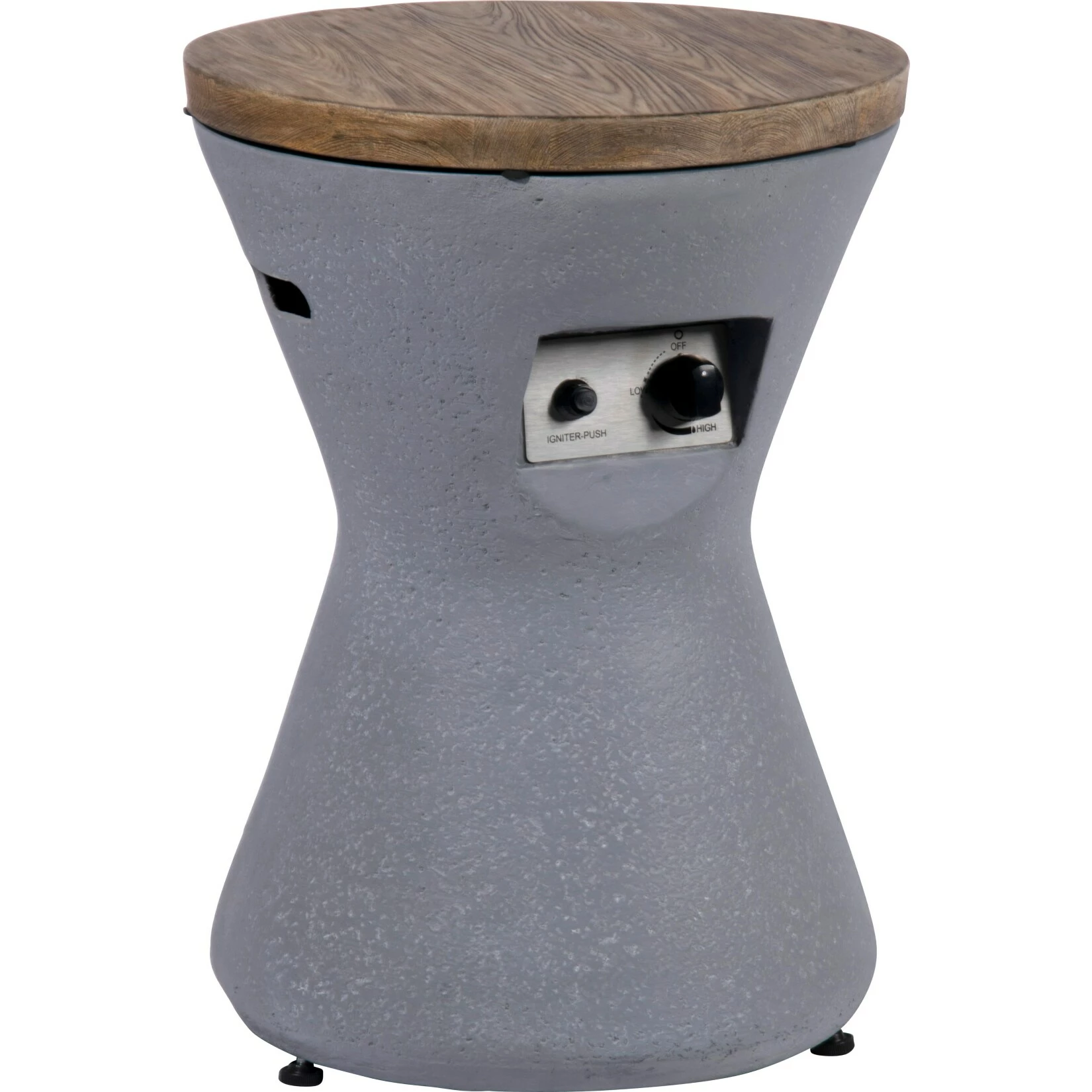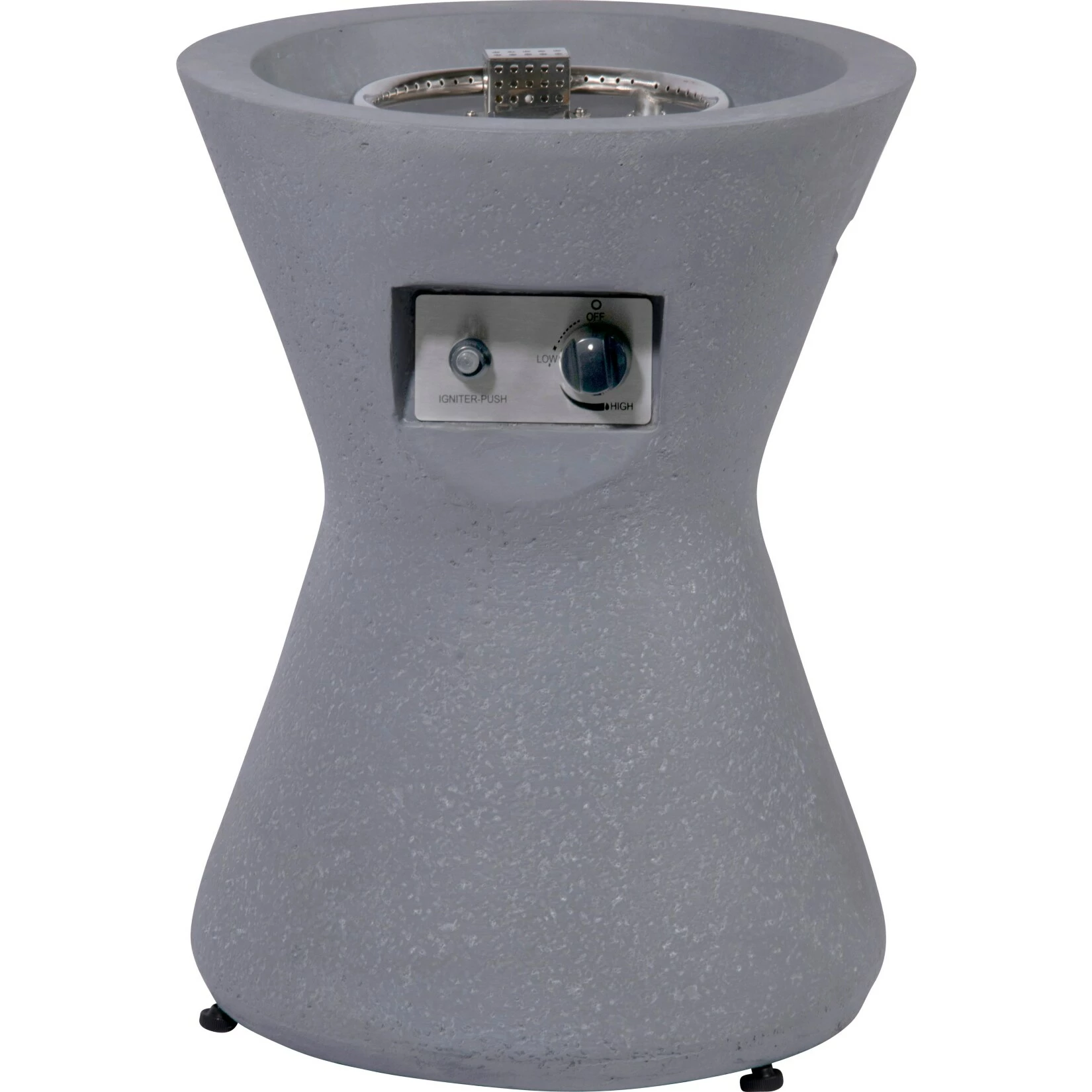 Der Lieferumfang der Feuerstelle umfasst eine praktische Abdeckung in Holz-Optik, eine Polyester-Abdeckung, einen Gasschlausch mit Regler (304,8 cm lang) und einen Metallständer.