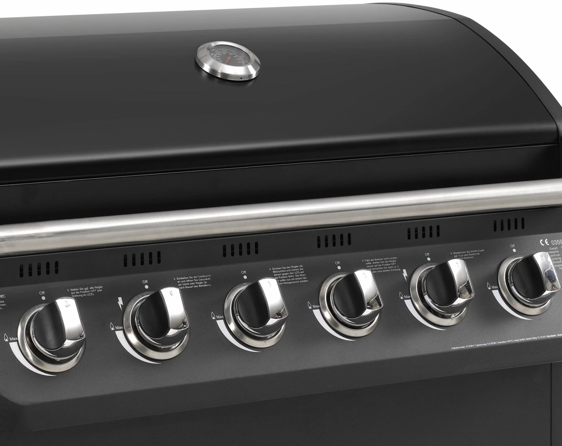 - Gasverbrauch: ca. 1506 g/h (6 Hauptbrenner je 209 g/h + 1 Seitenbrenner 250 g/h)