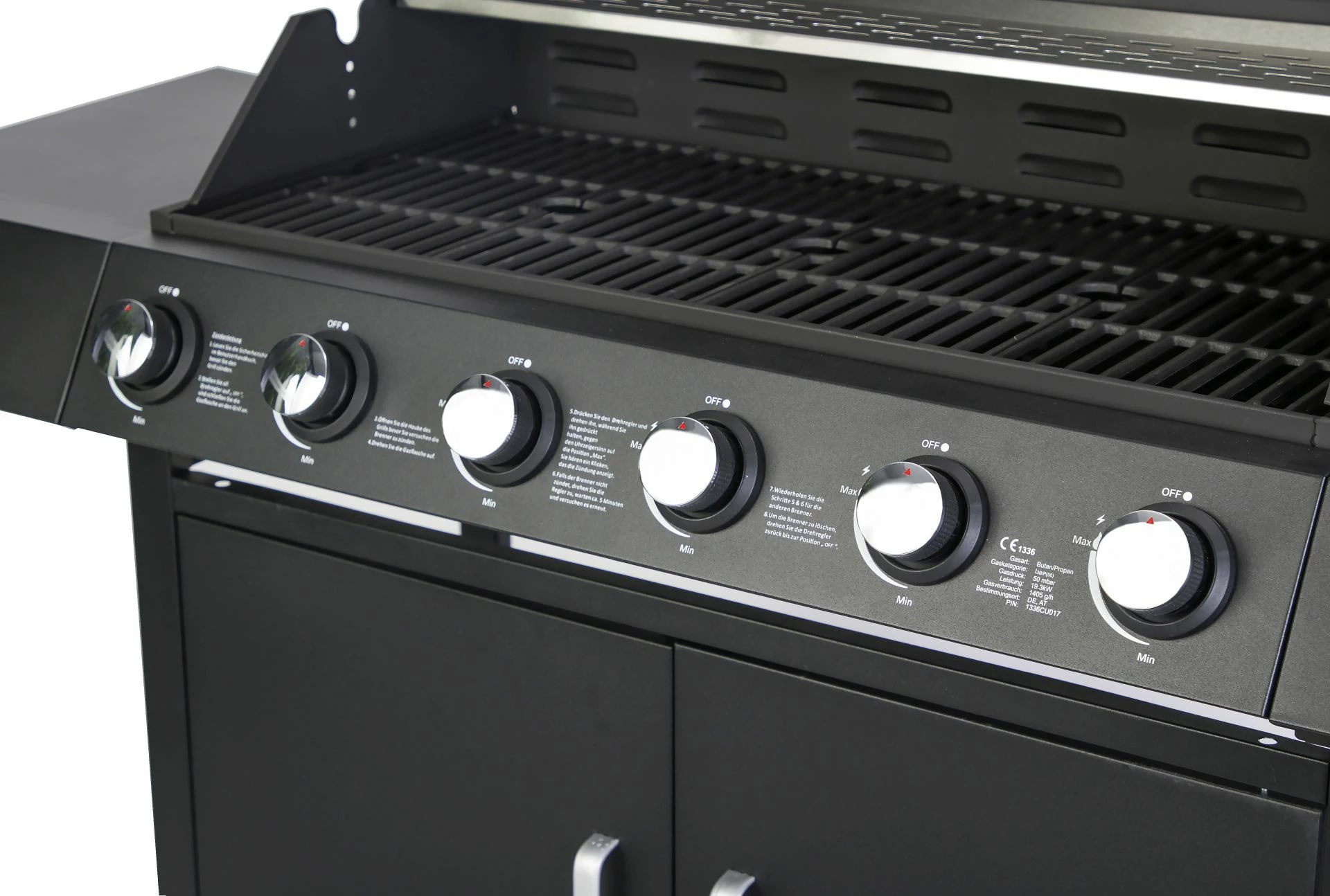 – Leistung: ca. 19,3 kW (6 Hauptbrenner je 2,8 kW + 1 Seitenbrenner 2,5 kW)