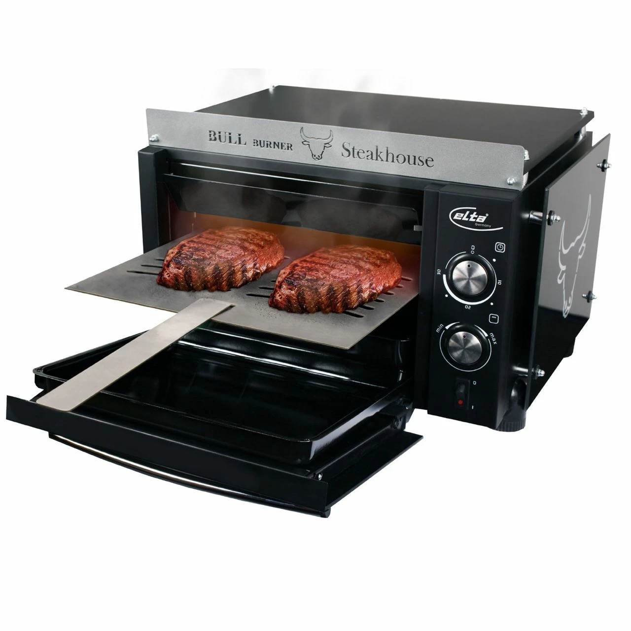 Mit dem Bull Burner werden Steaks bei 800°C Oberhitze aus dem keramischen Infrarotbrenner innerhalb wenige Minuten zum perfekten Grillgut.