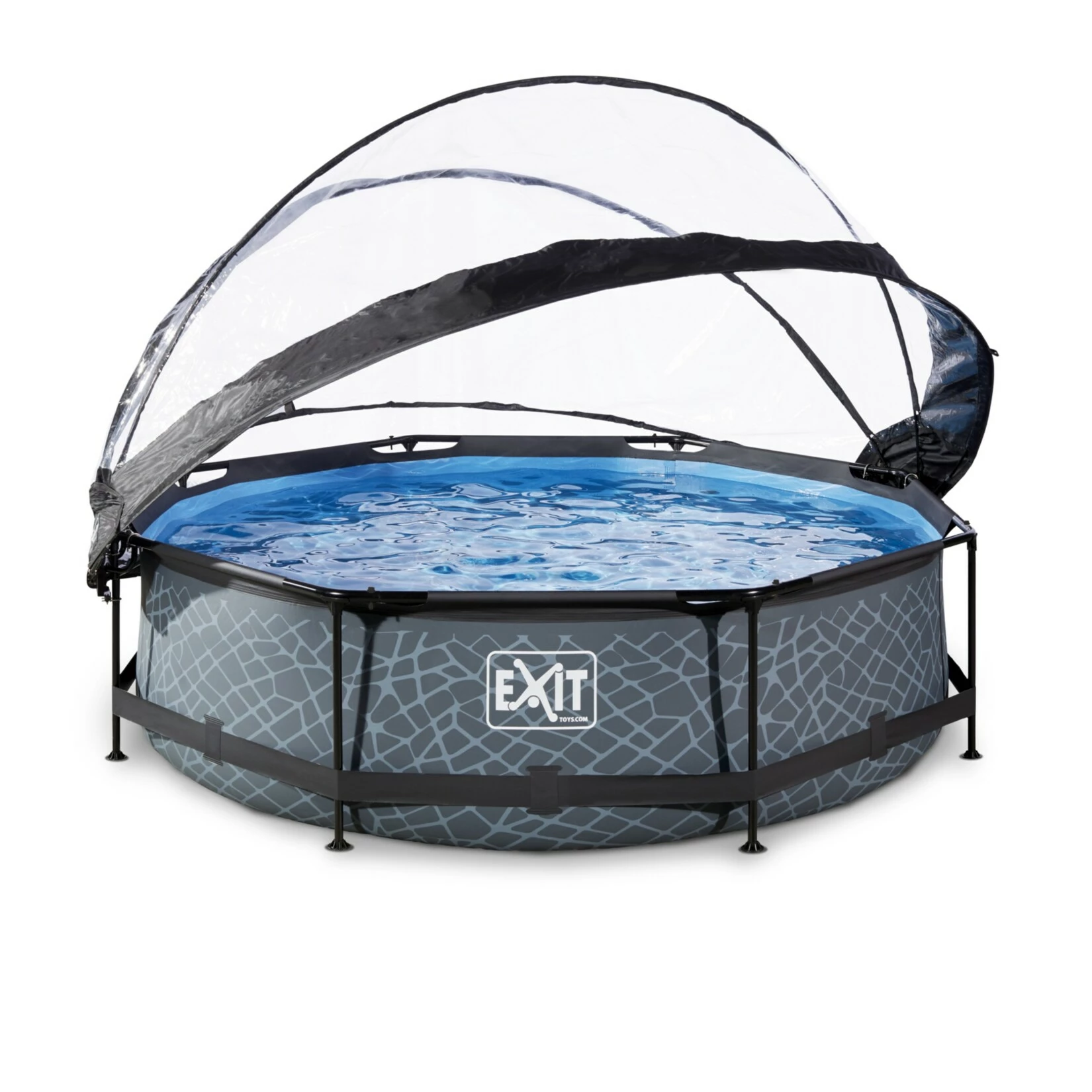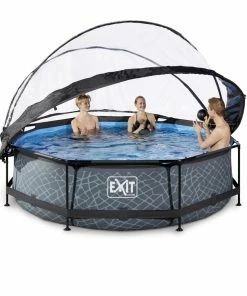 Das EXIT Aufstellbecken Ø 300 x 76 cm inkl. Sonnendach in grau ist ein runder grauer Rahmenpool mit Abdeckung.