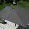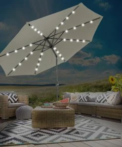 Der Gartenfreude Sonnenschirm ist aus einem stabilem Stahlgestell gefertigt. Der Durchmesser vom stabilen Schaft beträgt 38 mm. Der Schirm ist mit einer leichtgängigen Kurbel ausgestattet, durch diese die Schirme sich leicht öffnen und schließen lassen. Durch das vorhandene Knickgelenk lässt sich der Schirm neigen. Die Anzahl der Streben beträgt 8, diese bestehen aus stabilem, pulverbeschichteten Stahl. Die Textilbespannung besitzt eine Windöffnung und ist aus 100% Polyester mit ca. 180g/m² gefertigt. Der Stoff ist wasserabweisend und bietet einen UV-Schutz von 50+. Der Schirmbezug ist tauschbar und das Schirmdach kann geneigt werden. Die Gesamthöhe beträgt 250 cm. Die 32 Solar LED Lampen sorgen mit ihrem stimmungsvollen Licht für ein angenehmes Ambiente