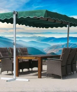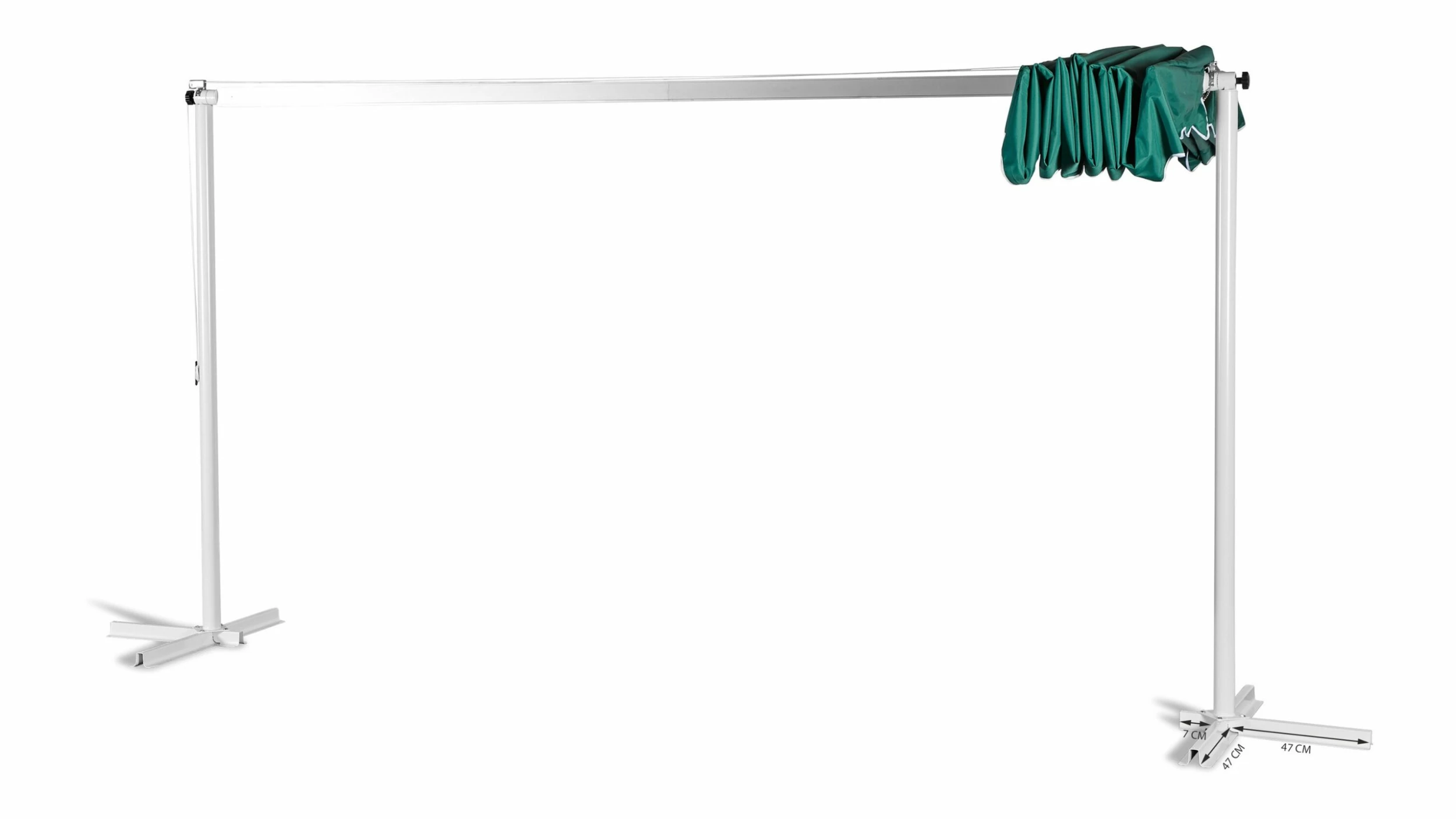 Die angegebenen Maße Länge x Breite beziehen sich auf die Dachfläche der Markise. Die Standbeine stehen über L x B x H: ca. 375 x 225 x 220cm.