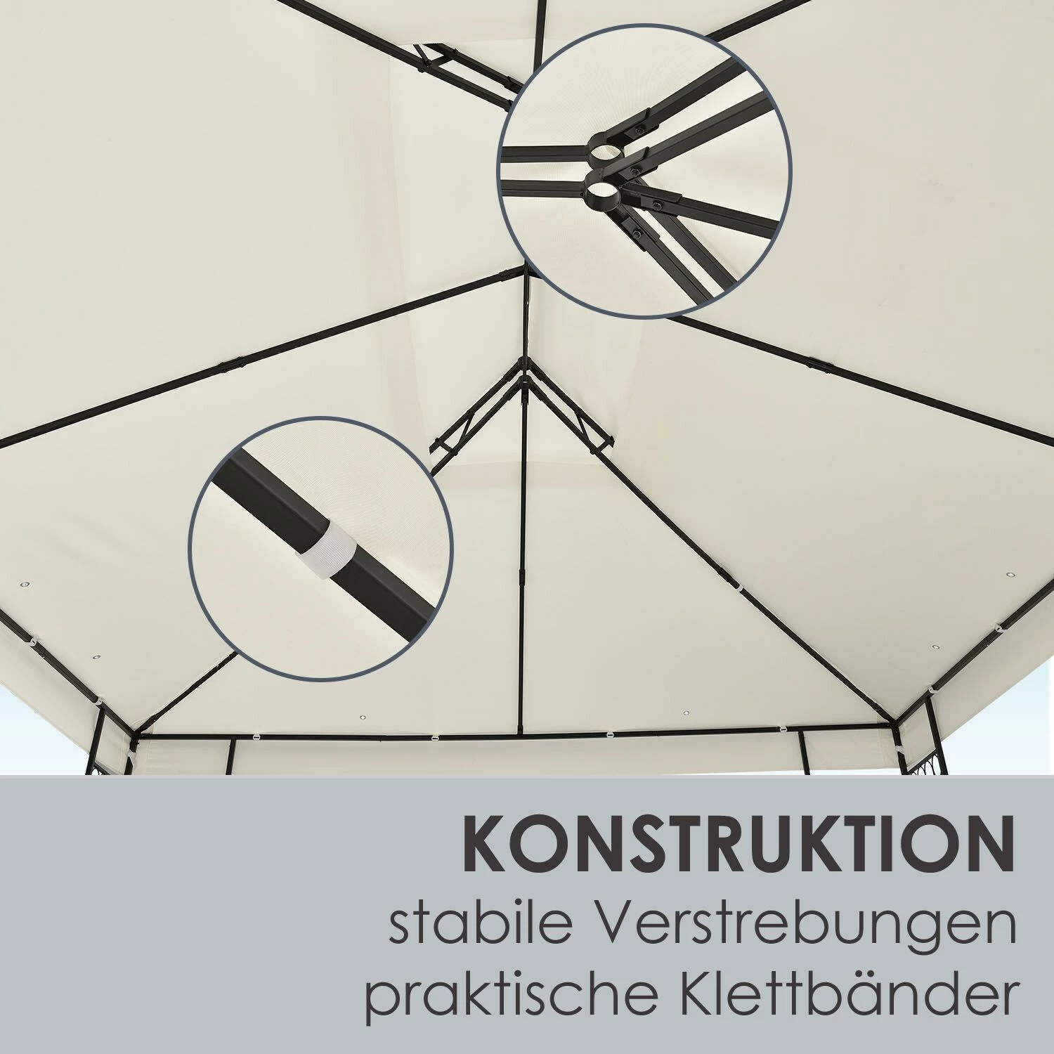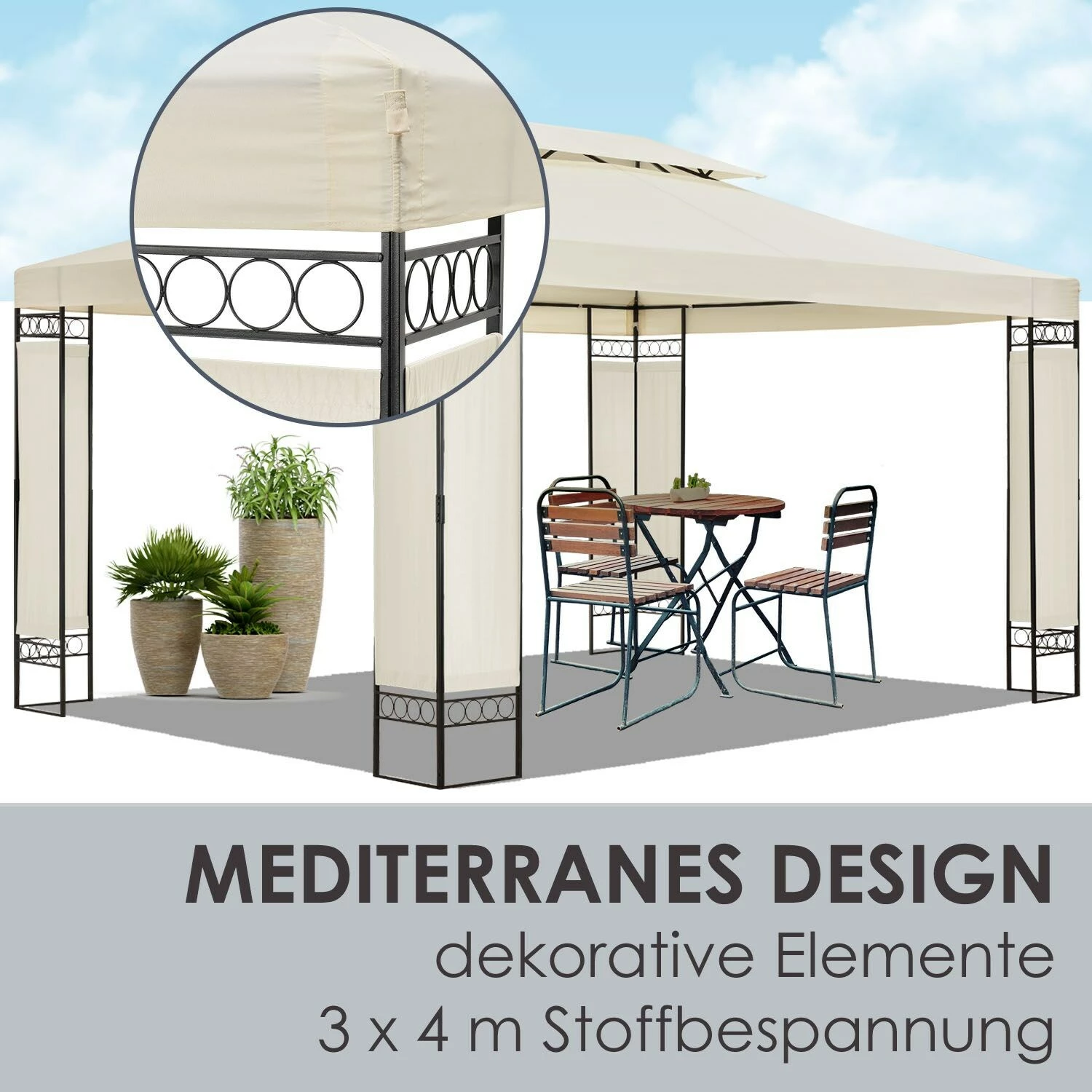 Die schlichte Optik in Beige mit den dekorativen Elementen an den Seitenpfosten gibt Ihrem Garten ein unbestechliches mediterranes Flair. Entspannen Sie mit einem Glas Rotwein unter der großen 3 x 4 m Stoffbespannung und fühlen sich wie in Italien.