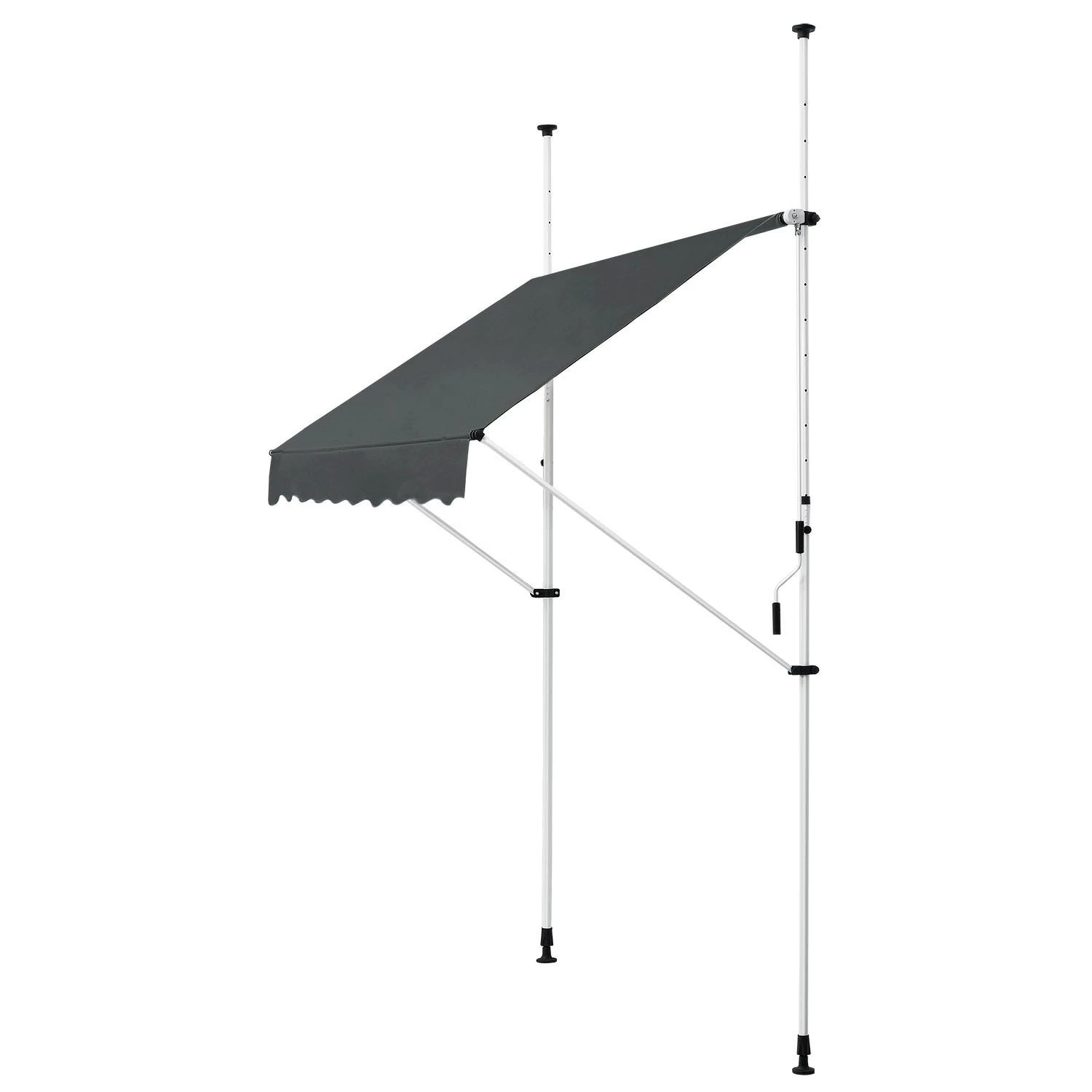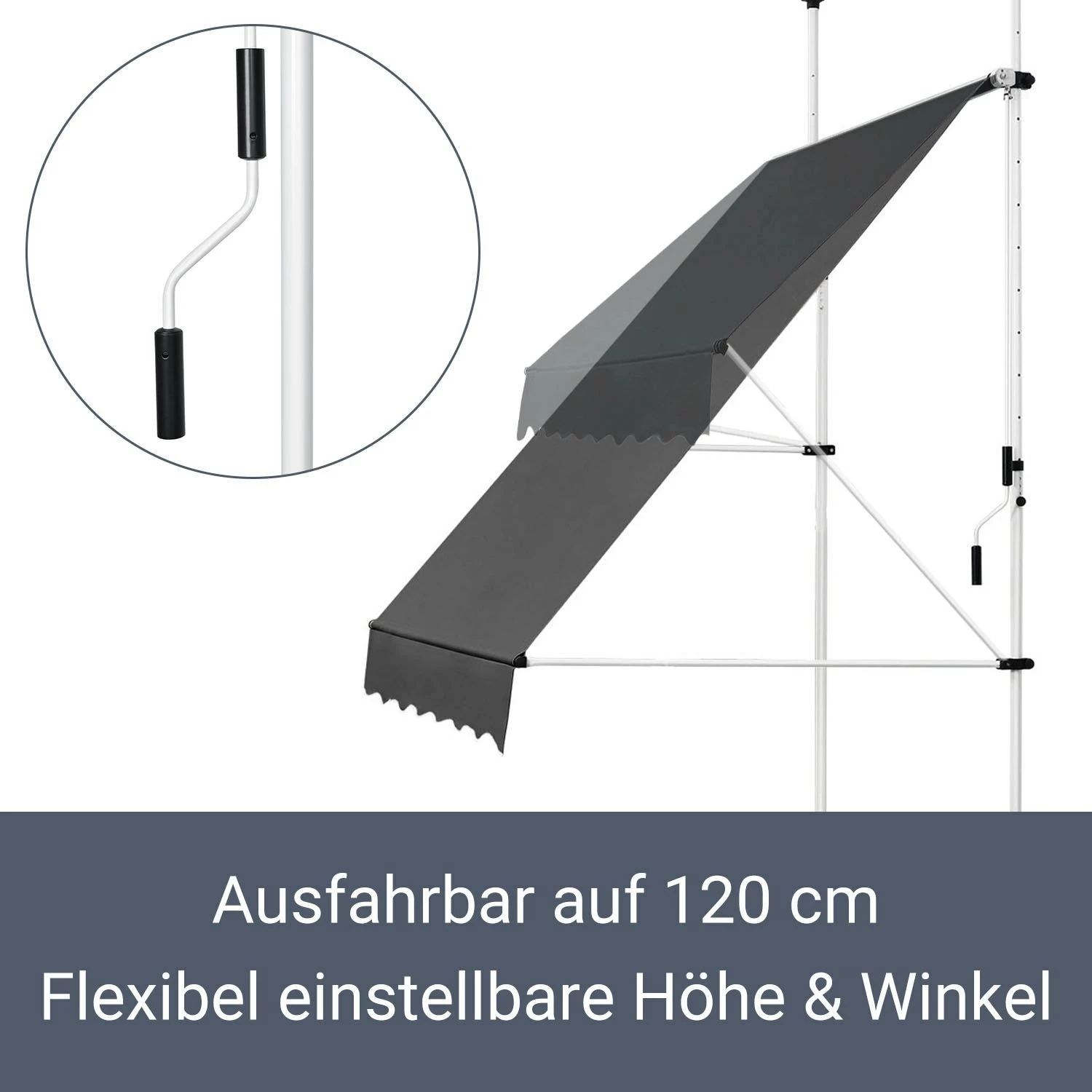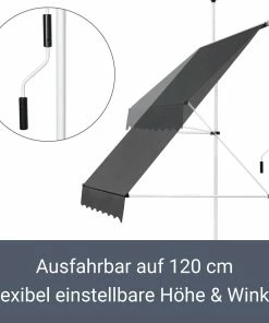 Ausgestattet mit einer 125 cm langen Kurbel ziehen Sie die Klemmmarkise manuell bis auf eine Länge von 120 cm aus. Der Neigungswinkel der Markise ist ebenfalls flexibel einstellbar. Zudem können Sie die Balkonmarkise in der Höhe zwischen 2 und 3 Meter einstellen.