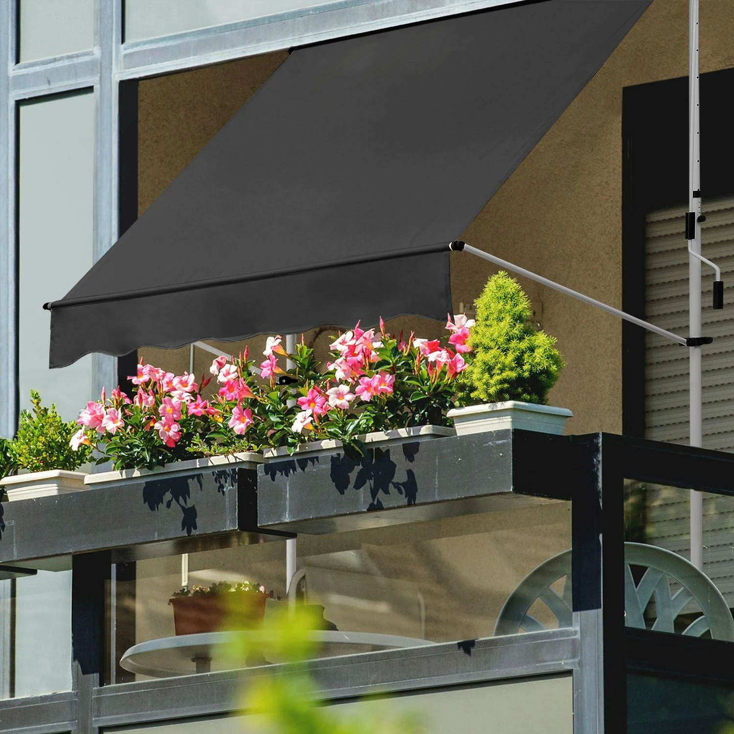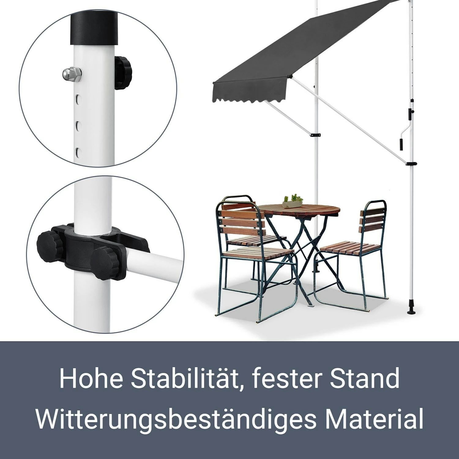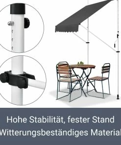 Das solide verarbeitete Gestell besteht aus pulverbeschichtetem Stahl. Das witterungsbeständige Material verleiht der Balkonmarkise trotz des geringen Gewichts eine hohe Stabilität. Die Pulverbeschichtung schützt das Gestell zudem vor Korrosion und anderen äußeren Einflüssen.