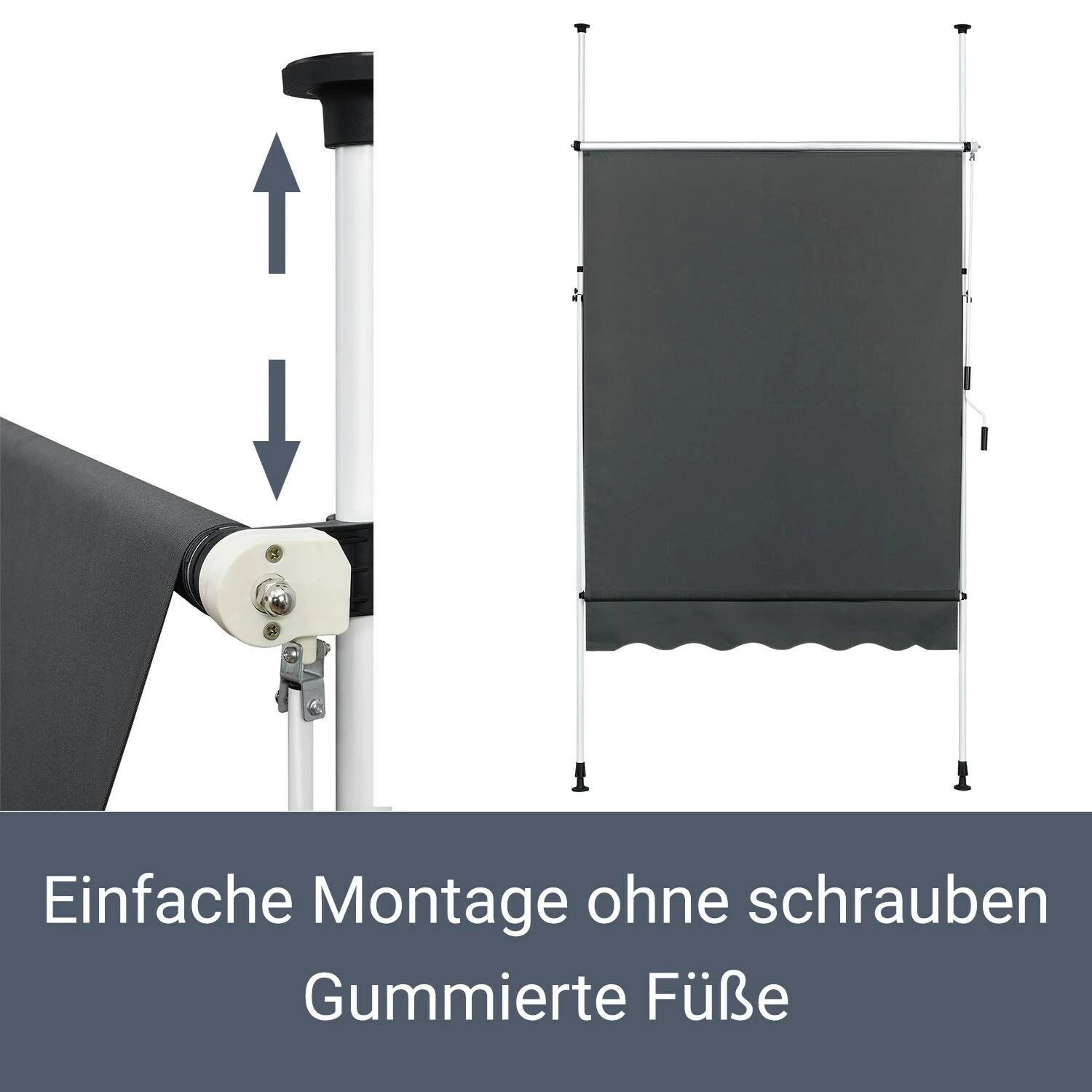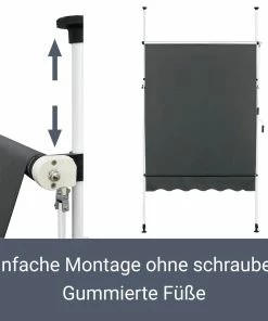 Für die Installation klemmen Sie die Sonnenmarkise mittels der seitlichen Standrohre einfach und schnell zwischen Boden und Decke – ganz ohne Bohren oder Schrauben. Durch die gummierten Füße oben und unten bleibt das Mauerwerk von Haus und Wohnung unversehrt. Ideal für den Einsatz in Mietobjekten.