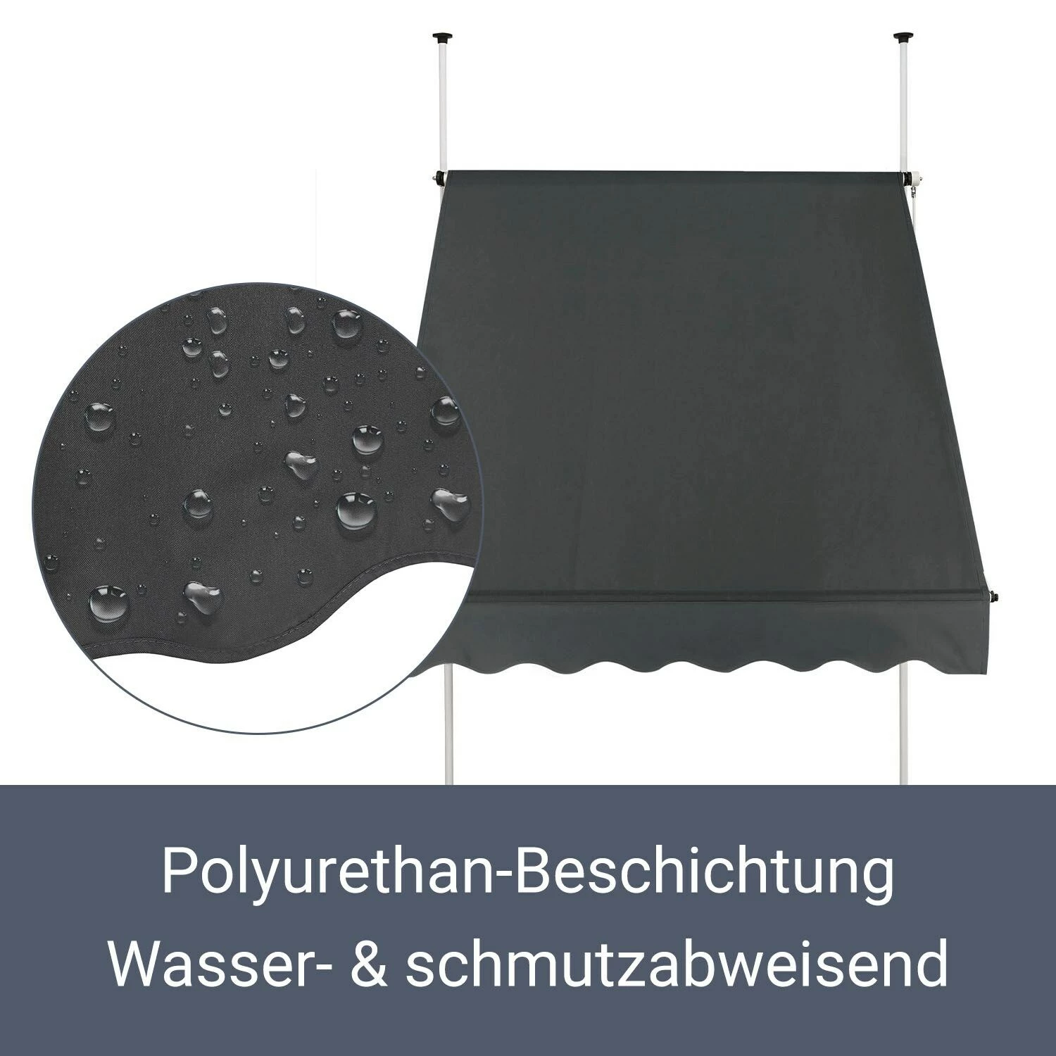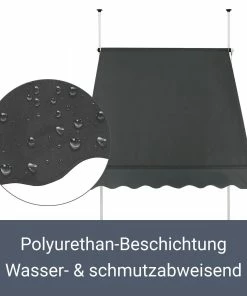 Das Markisentuch ist aus qualitativ hochwertigem Polyester gefertigt und mit einer Polyurethan-Beschichtung versehen. Der blickdichte Stoff schützt Sie unter dem Sonnendach vor starkem Sonnenlicht und reduziert die gefährliche UV-Strahlung. Durch die Beschichtung ist das 180 g/m² starke Gewebe zudem wasser- und schmutzabweisend.