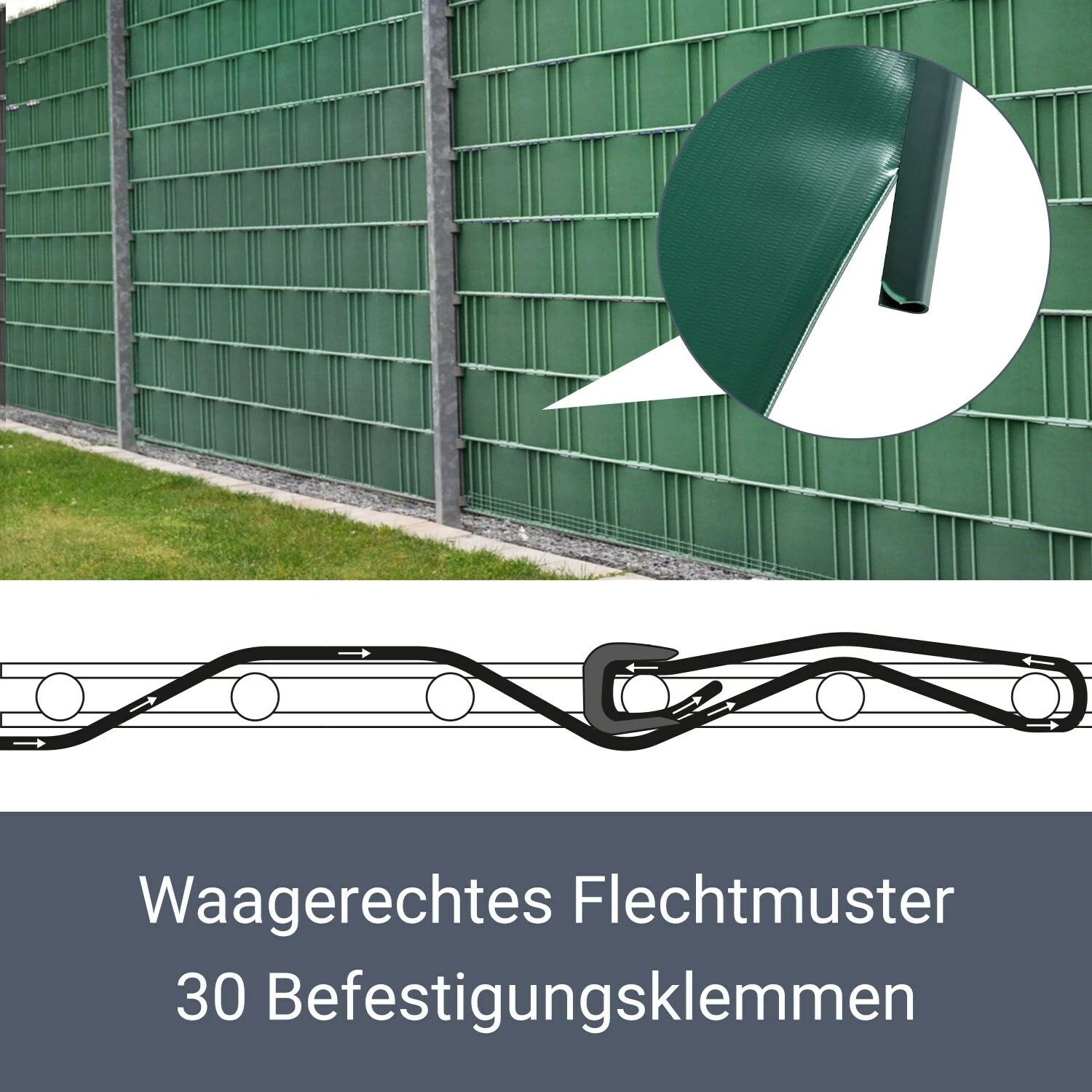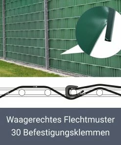 Flechten Sie den PVC Streifen einfach waagerecht in Ihren Zaun ein. Das Flechtmuster kann dabei frei gestaltet werden. Starten sollten Sie aber immer am Anfang des Zaunes. Am Ende angekommen, wird die Zaunblende einfach umgeklappt und unkompliziert mit den 30 mitgelieferten Clips fixiert.