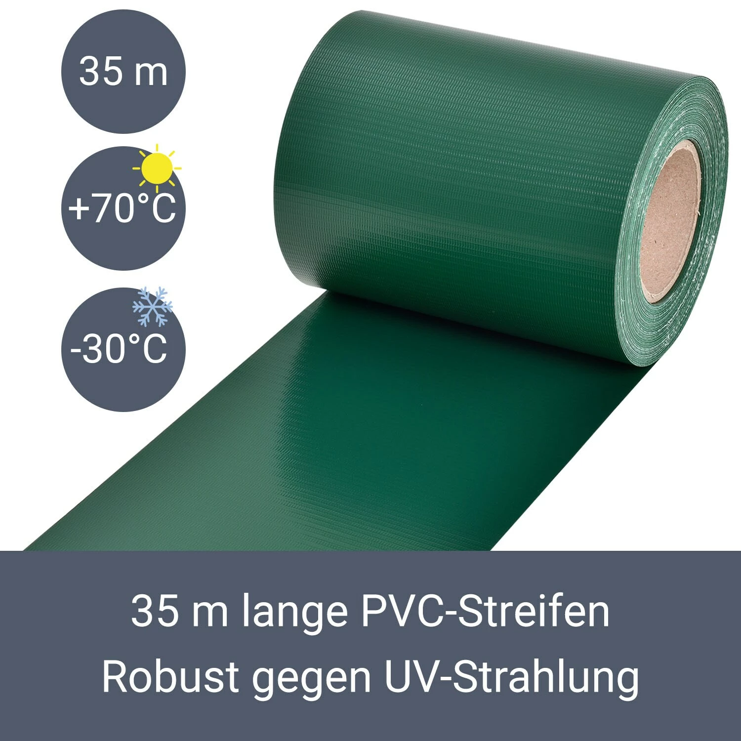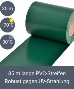 Unser 35 Meter langer PVC-Streifen bietet Temperaturen von -30°C bis +70°C problemlos die Stirn. Auch bei stärkster UV-Strahlung behält das strapazierfähige Material Form und Farbe bei, so dass Ihr Sichtschutz auch nach Jahren noch wie neu aussieht.