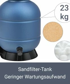 In dem großen Tank ist Platz für 23 kg Sand, durch den das Poolwasser gefiltert wird. Filterbälle eignen sich ebenso als Filtermaterial. Die Beliebtheit von Sandfilter-Anlagen lässt sich nicht nur durch die hohe Leistungsfähigkeit, sondern auch durch den geringen Wartungsaufwand erklären. Ist der Tank einmal gefüllt, muss dieser bei regelmäßiger Reinigung jahrelang nicht mehr getauscht werden.