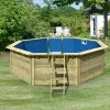 Mit einer Wassertiefe von 111 cm, die sich über die PoolDiagonale von über 5 Metern erstreckt, können Sie ganz bequem Schwimmen odersogar Tauchen. Insgesamt warten hier rund 15.000 Liter Wasserinhalt darauf, vonIhnen erobert zu werden. Der Einstieg gelingt bequem über die mitgeliefertenEinstiegsleitern aus Edelstahl für die Innenseite und Holz für die Außenseite.