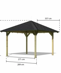 Der Pavillon bietet dank der quadratischen Grundform und einem Außenmaß von 289 cm x 289 cm viel Platz zum Sitzen, Entspannen, Grillen und Feiern. Das Dachstandmaß von 357 cm x 357 cm schützt Sie vor Sonne, Regen und Schnee, sodass Sie Ihre Zeit im Freien unabhängig vom Wetter genießen können.