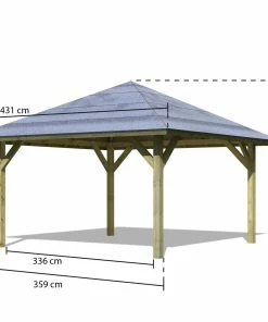 Der Pavillon bietet dank der quadratischen Grundform und einem Außenmaß von 359 x 359 cm viel Platz zum Sitzen, Entspannen, Grillen und Feiern. Das Dachstandmaß von 431 cm x 431 cm schützt Sie vor Sonne, Regen und Schnee, sodass Sie Ihre Zeit im Freien unabhängig vom Wetter genießen können.