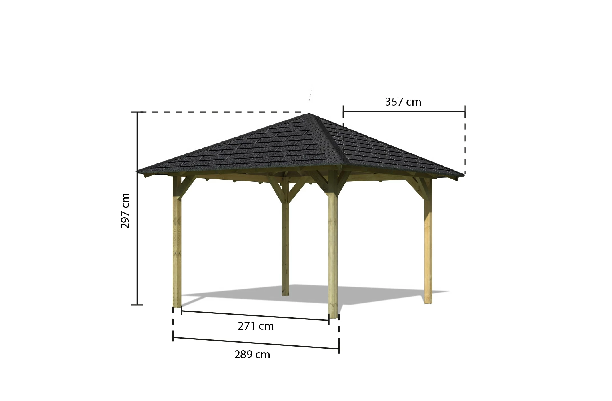 Der quadratische Pavillon hat ein Außenmaß von 289 cm x 289 cm und ein Dachstandmaß von 357 cm x 357 cm. Die Seitenhöhe beträgt 199 cm, der First misst 297 cm. Das formschöne Walmdach wird von 4 Pfosten gestützt, die jeweils 9 cm x 9 cm stark sind. Die Pfosten und weiteren Sparren Querverbinder sind kesseldruckimprägniert und somit gegen Witterungseinflüsse bestens geschützt. Wir empfehlen die Verwendung von unseren passenden H-Ankern mit einer Länge von 60 cm für die Befestigung im Untergrund.