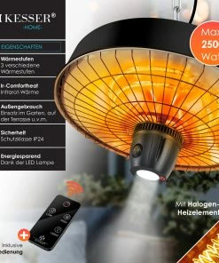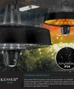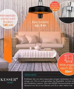 Aus dem Hause KESSER bieten wir Ihnen ein sowohl optisches als auch technisches Highlight an. Dieser schöne und leistungsstarke Deckenstrahler überzeugt mit einer Leistung von bis zu 2500 Watt. Trotz seiner guten Heizleistung ist dieser kompakt und variabel – einem vielfältigen Einsatz im Garten, der Garage oder auch in Gartenhäusern bzw. auf der Terrasse steht somit nichts im Wege. Dank des Quarzheizelementes bzw. dem elektrischen Anschluss heizen Sie Geruchs-, Rauchs– und Lautstärkefrei.