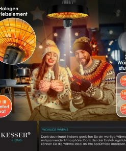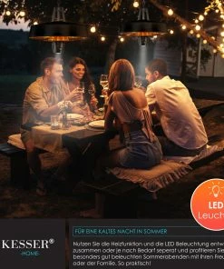 Mit dem KESSER Deckenheizstrahler genießen Sie zu jeder Jahreszeit längere gesellige Zusammenkünfte oder lauschige Abende draußen. Der Infrarotstrahler mit Halogen–Heizelementen bietet insbesondere an kälteren Tagen eine leistungsstarke Wärme– und Lichtquelle. Im Gegensatz zu gewöhnlichen Heizlüftern erwärmt die Infrarot–Strahlung nicht nur die Umgebungsluft, sondern überträgt die Wärme gezielt an die angestrahlten Menschen und Objekte. Das sanfte Licht sorgt für zusätzliche Gemütlichkeit.