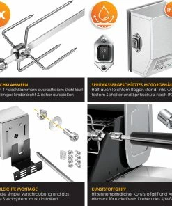 Mit den 4 Fleischklammern aus rostfreiem Stahl lassen sich viele leckere Spezialitäten kinderleicht und sicher aufspießen. Das spritzwassergeschützte Motorgehäuse hält auch leichtem Regen stand, so müssen sich auch bei schlechterer Witterung nicht auf einen Grillabend mit Ihren liebsten verzichten. Sicherer Schutz dank wetterfestem Schalter und einem Spritzschutz nach IPX4.