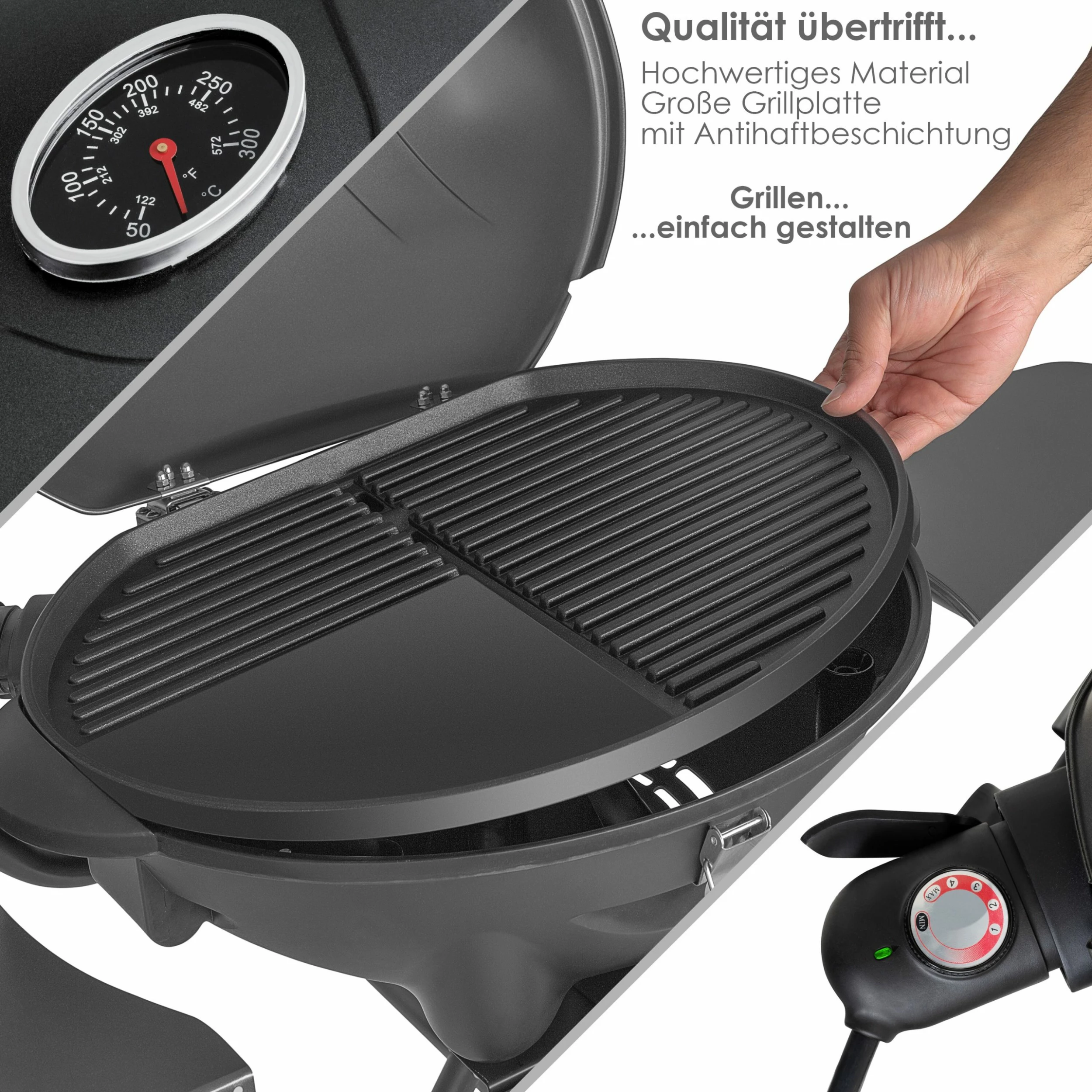 Das Gestell ist mit einem Handgriff zusammen geklappt und benötigt nur eine kleine Fläche in der Garage im Schuppen oder im Keller. Der Elektrogrill überzeugt vor allem durch seine platzsparende Falt–Konstruktion. Temperaturregler mit 4 Stufen und Kontrollleuchte sowie ein integrierter Thermometer im Deckel für eine optimale Temperaturkontrolle.