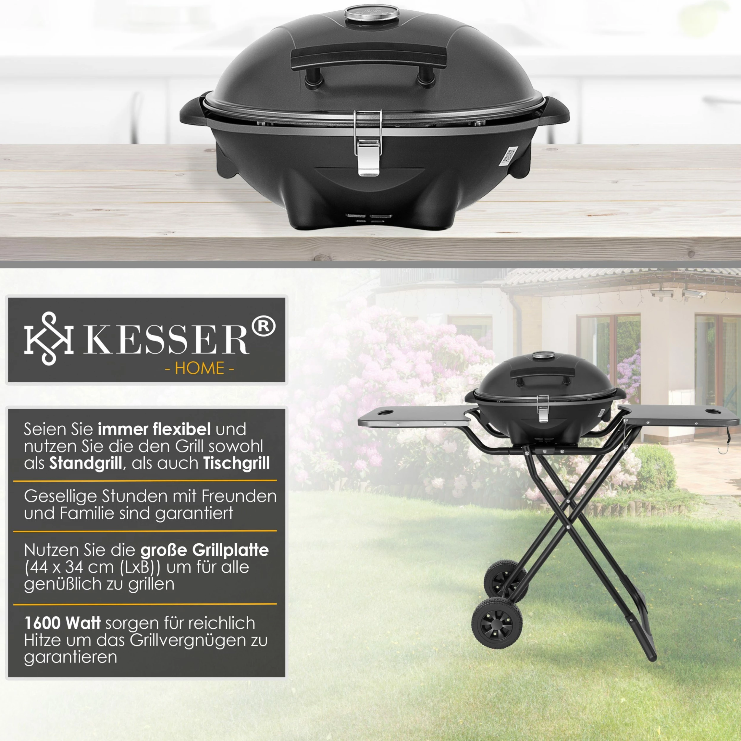 Der 2in1 elektrische Standgrill mit Deckel und Ablagefläche kann auf Balkon Terrasse, im Garten und auf dem Küchentisch verwendet werden, wenn der Grill vom Gestell abgenommen wird als Tischgrill verwendbar.