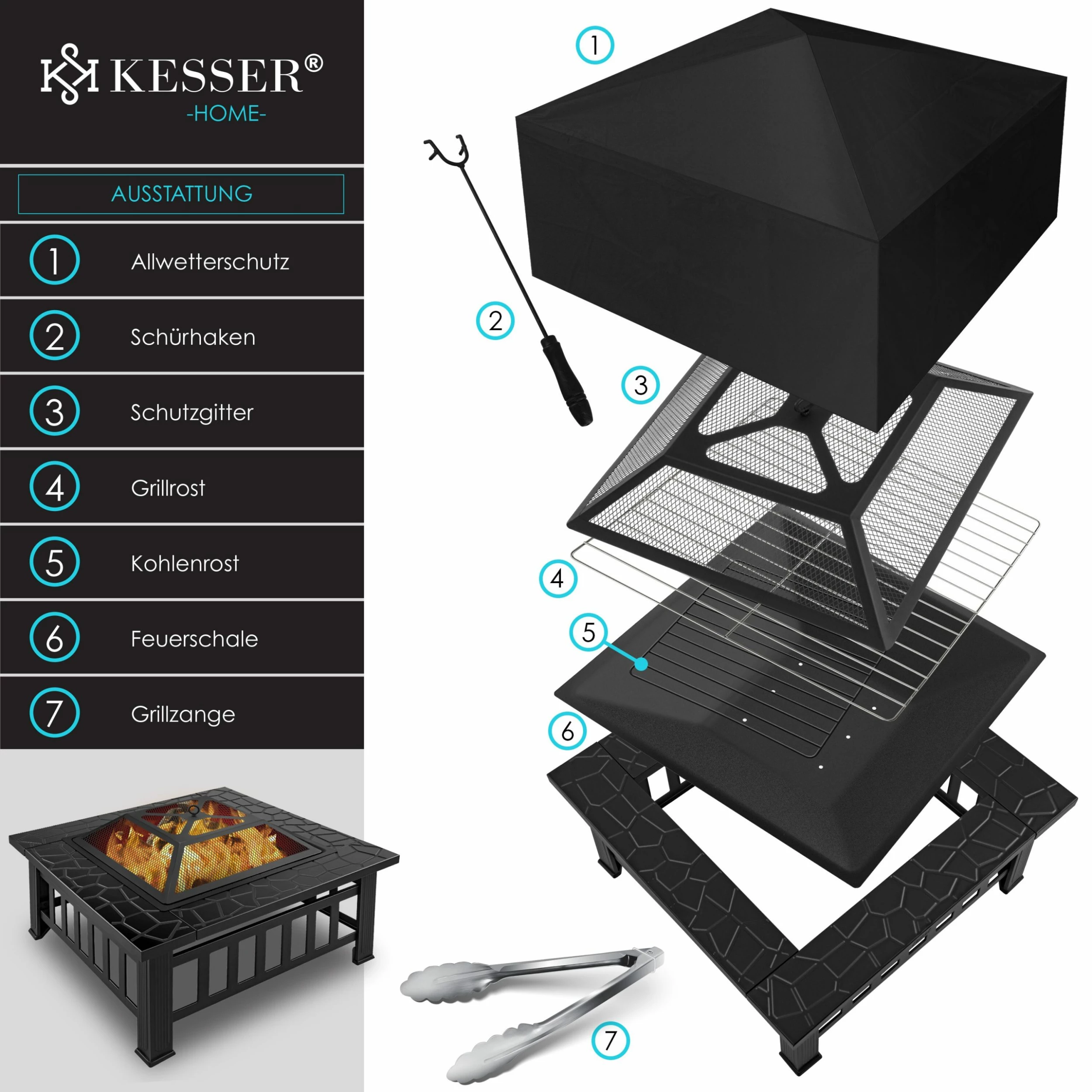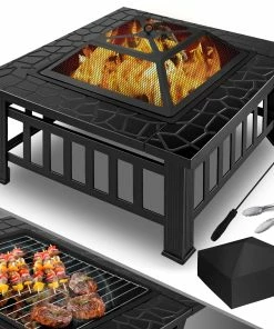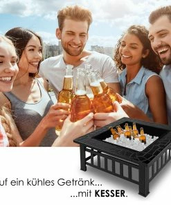 KESSER 3in1 Multifunktionale Vierkant Feuerstelle inklusive Grillrost, Fire Pit für Heizung und BBQ, Allwetterschutz, Schürhaken, und Grillzange.