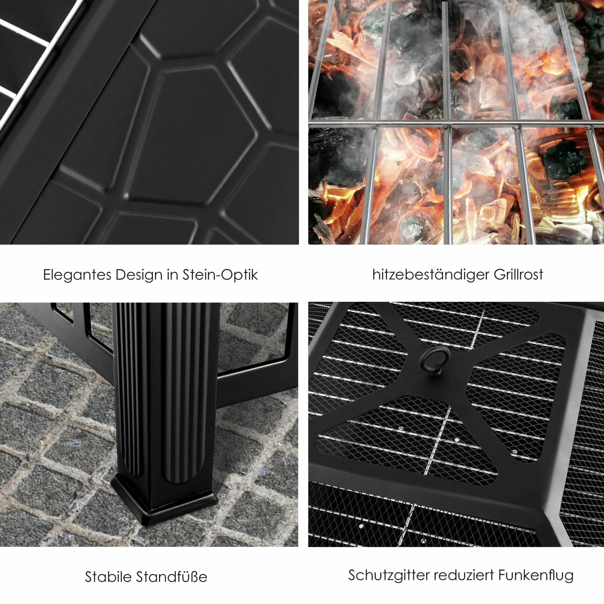 • Doppelte Sicherheit vor Glut und Splittern durch den Funkenschutzdeckel und vier robuste Standfüße