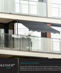 Hochwertige Klemmmarkise der Marke KESSER, einfache Montage, senkrecht und diagonal ausfahrbar, ausfahrbar durch Kurbelbetrieb, flexibel für verschiedene Höhen, UV-Schutz, wasserabweisend