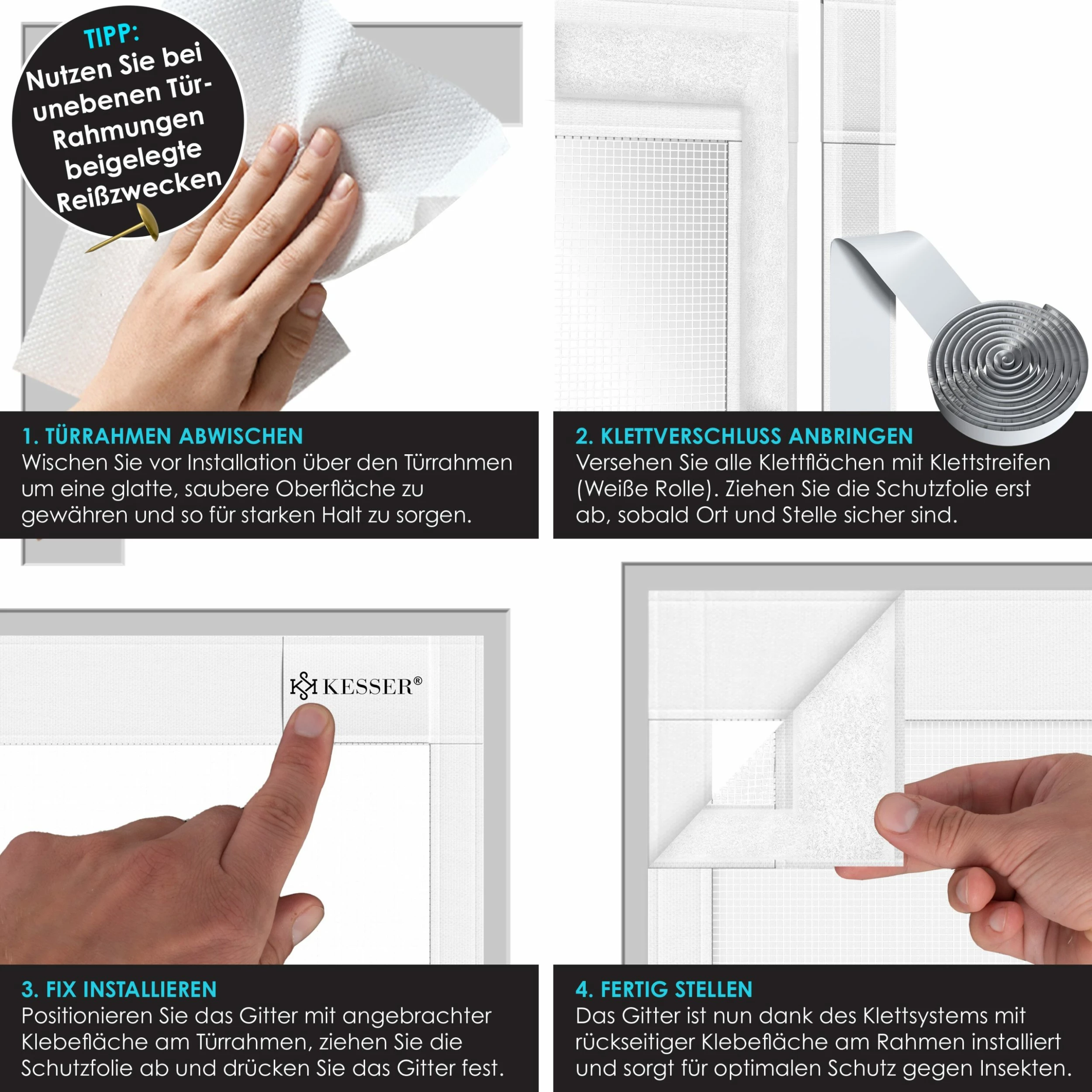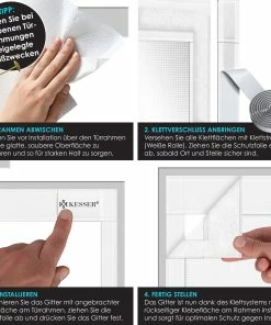 Die Montage ist ebenfalls unkompliziert und lässt sich in nur wenigen Schritten durchführen. Wischen Sie einfach vor der Installation über den Türrahmen um eine glatte, saubere Oberfläche zu schaffen und so für starken Halt zu sorgen. Versehen Sie alle Klettflächen mit Klettstreifen. Ziehen Sie die Schutzfolie ab, sobald Ort und Stelle sicher sind. Positionieren Sie das Gitter mit angebrachter Klebefläche an dem Türrahmen, ziehen Sie die Schutzfolie ab und drücken Sie das Gitter fest. Das Gitter ist nun dank des Klettsystems mit rückseitiger Klebefläche am Rahmen installiert und sorgt für optimalen Schutz. – Tipp: Nutzen Sie bei unebenen Türrahmen die beigelegten Reißzwecken!