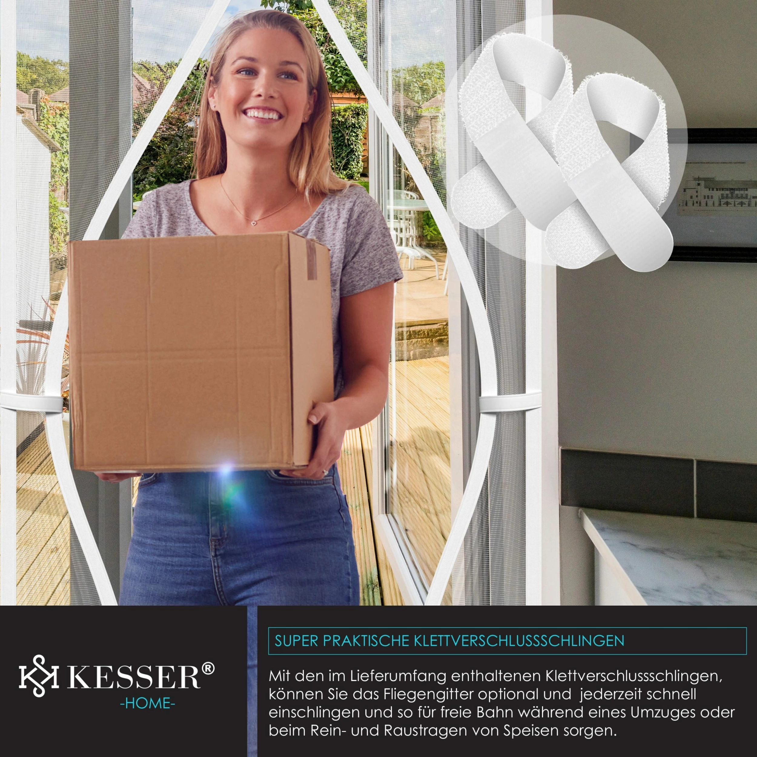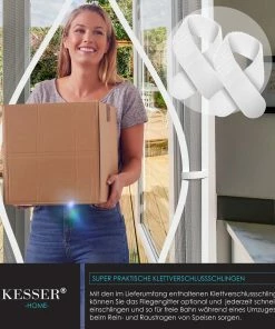 Mit den im Lieferumfang enthaltenen Klettverschlussschlingen können Sie die Balkontür optional und jederzeit schnell fixieren und so für freie Bahn während eines Umzuges oder beim Rein– und Raustragen von Speisen und Getränken sorgen. Mit dem hochwertigen Fliegengitter von KESSER verbringen Sie sorglose und entspannte Momente in Ihrem Garten, auf der Terrasse und dem Balkon, während trotz erstklassigem Schutz vor allerart Insekten, für eine optimale Luftzirkulation gesorgt ist.