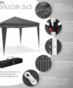 Metallverstrebungen und verankerbare Füße geben diesem Pavillon einen guten Stand. Die obere Dachbespannung besteht aus einer wasserabweisenden reinen Textilzusammensetzung von 220D Oxford – 100% Polyester.