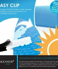 Nutznießen Sie von einer einfachen und schnellen Montage dank dem cleveren Klettsystem und der einfachen Zusammenführung der Stangen. Die rutschfesten Griffmöglichkeiten an der Poolaufroller–Konstruktion bieten Ihnen zusätzliche Stabilität bei Aufrollprozessen. Befestigen Sie Ihre Abdeckplane oder Solarplane schnell und einfach mit den stabilen Klammern.