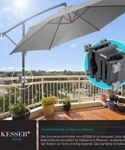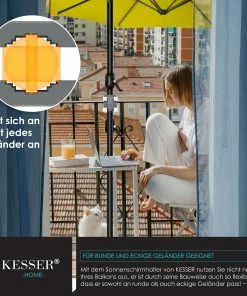 Mit dem Sonnenschirmhalter von KESSER nutzen Sie nicht nur 100% Ihres Balkons aus, er ist zusätzlich durch seine Bauweise auch so flexibel, dass er sowohl an runde als auch eckige Geländer passt. – Einfach flexibel und immer bestens vorbereitet. Der Sonnenschirmständer ist so kompakt, dass die Balkonfläche frei bleibt für Möbel und Pflanzen. Außerdem wird der Balkon so nicht unnötig belastet.