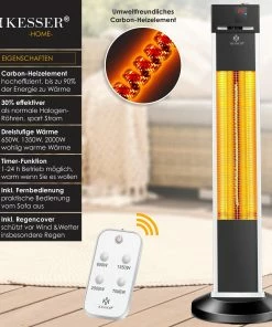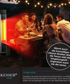Die KESSER Infrarot–Elektroheizung ist aufgrund ihrer hohen Qualität zu einer idealen Wahl für den privaten und gewerblichen Gebrauch geworden. Mit dem eleganten Design, der hochwertigen Verarbeitung und den effizienten Funktionen eignen sich unsere Wärmelampe sehr gut für den modernen Außenbereich oder die Gastronomie. Dank der angenehmen und sonnenähnlichen Strahlungswärme können Ihre Gäste, Freunde und Familie auch bei feucht–kaltem Wetter draußen sitzen.