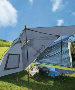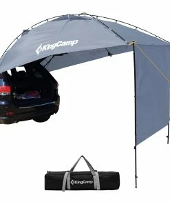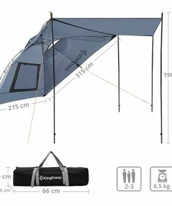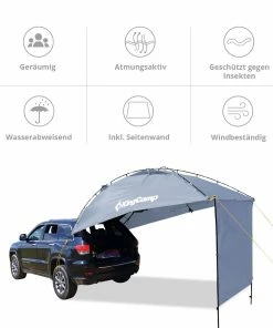 Der kinderleichte Aufbau geht schnell und den Einsatzmöglichkeiten sind kaum Grenzen gesetzt. Das hochwertige Zeltdach aus 150D Oxford Gewebe lässt sich am Heck und seitlich am Fahrzeug befestigen und ist auch problemlos ohne Auto, als Pavillon mit Aufstellstangen oder als Bodenaufbau, zu verwenden. Belüftungen im Schirm ermöglichen den Durchzug frischer Luft, was auch die Stabilität des Zeltes bei Wind erhöht. Das seitliche Fenster kann je nach Bedarf geöffnet oder abgedeckt werden und die hohe Wassersäule von 2000 mm hält selbst starkem Regen Stand.
