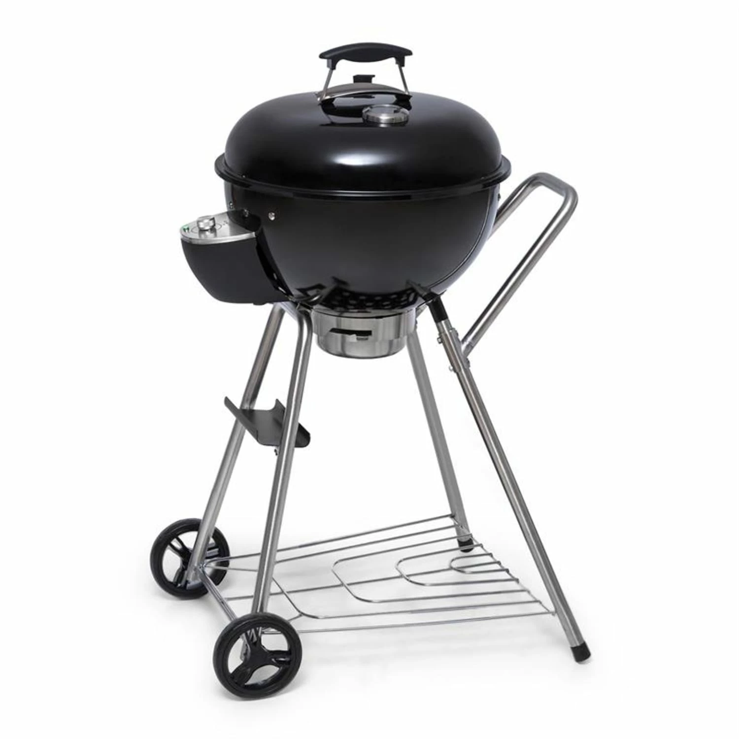 Eine kleine Ablagefläche unter dem Ventilator bietet darüber hinaus Platz für Getränke, Besteck oder Soßen, während auf einem großen Abstellgitter ausreichend Platz für einen Sack Holzkohle bereitsteht. Das robuste Gestell aus rostfreiem Edelstahl sorgt jederzeit für einen sicheren Stand und hebt den Klarstein Beef Baron Kugelgrill auf eine angenehme Arbeitshöhe. Mit Hilfe der 2 angebrachten Bodenrollen lässt er sich zudem mühelos transportieren und versetzen.