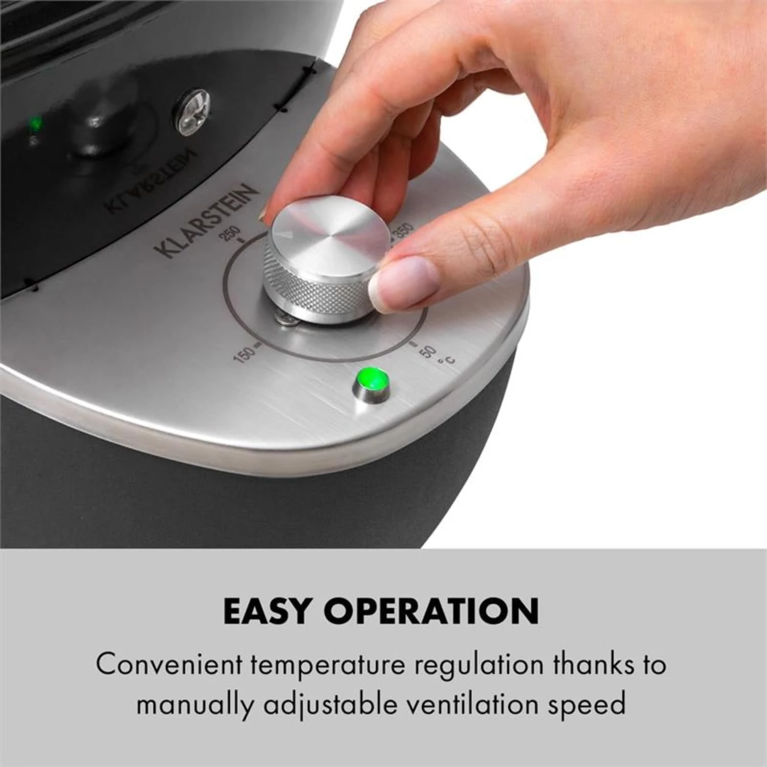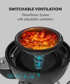 Das FlameTamer System mit zuschaltbarer, batteriebetriebener Belüftung ermöglicht mit Hilfe eines stufenlosen Drehreglers die bequeme Regulierung der Temperatur im Bereich zwischen 50 und 350 °C . Dank integriertem Thermostat erkennt das Gerät bei geschlossener Grillhaube die eingestellte Temperatur und schaltet bei Erreichen der gewünschten Hitze den Ventilator automatisch aus. Wenn die gemessene Temperatur unter dem Sollwert liegt, wird der Ventilator automatisch wieder gestartet. Zusätzlich erzeugt die kuppelförmige Konstruktion einen Wärmesog wie bei normalen Öfen, der über einen Lüftungsschieber im Deckel gesteuert wird und die Einstellung der Temperatur zusätzlich erleichtert. So kann mit dem Kugelgrill nicht nur ganz normal auf dem Rost gegrillt, sondern auch über einen längeren Zeitraum hinweg gegart, gebraten oder geräuchert werden. Durch ein am Deckel angebrachtes Thermometer mit einer Anzeige von 50 bis 550 °C behält man die Temperatur im Innern des Grills außerdem zuverlässig im Blick.